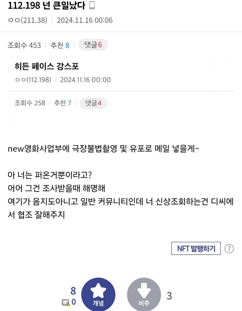 인생은도박이다님의 댓글 인생은도박이다쪽지보내기 자기소개 닉네임으로 검색쪽지보내기 자기소개 닉네임으로 검색 작성일 2024.11.16 00:16 근데 짜치게 무슨 시사회를 불법 촬영하고 자빠졌노 근데 짜치게 무슨 시사회를 불법 촬영하고 자빠졌노
