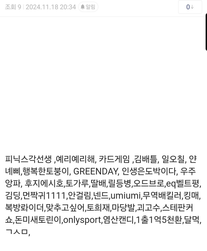 명단오류 죄송합니노 작성자 정보 쫄병쪽지보내기 자기소개 닉네임으로 검색쪽지보내기 자기소개 닉네임으로 검색 작성 작성일 2024.11.18 22:08 컨텐츠 정보 136 조회 3 댓글 0 추천 목록 본문 일하면서하다가 밑에글누른듯 0 추천 관련자료 이전 명단만보내고 할매가뽑아용 작성일 2024.11.18 22:10 다음 쫄병아 내 이름 다시 적어라..아 작성일 2024.11.18 22:07 댓글 3 안걸림님의 댓글 안걸림쪽지보내기 자기소개 닉네임으로 검색쪽지보내기 자기소개 닉네임으로 검색 작성일 2024.11.18 22:11 줬다 뺏는게 최악인데 줬다 뺏는게 최악인데 리을님의 댓글 리을쪽지보내기 자기소개 닉네임으로 검색쪽지보내기 자기소개 닉네임으로 검색 작성일 2024.11.19 00:08 오류 있었구나 오류 있었구나 두두님의 댓글 두두쪽지보내기 자기소개 닉네임으로 검색쪽지보내기 자기소개 닉네임으로 검색 작성일 2024.11.19 10:17 와 개많노 와 개많노 로그인한 회원만 댓글 등록이 가능합니다. 목록