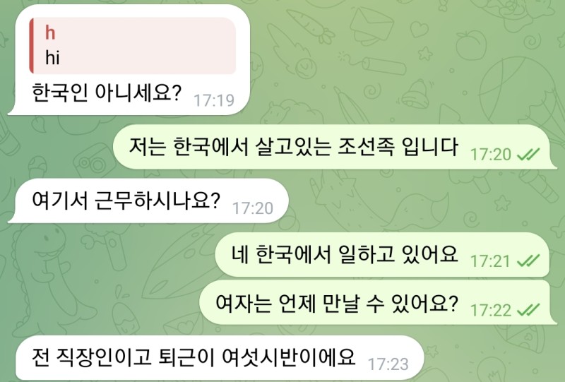 하루에도 몇번씩 오길래 한번은 궁금해서 저기 적힌 톡으로 연락해봤는데 신안에서 일하는 조선족인데 연변에 있는 가족들 위해서 한국에서 쉬는 날 없이 열심히 일하는 중이라고 하니까 동포애 느껴졌는지 상대방이 먼저 연락 끊음.