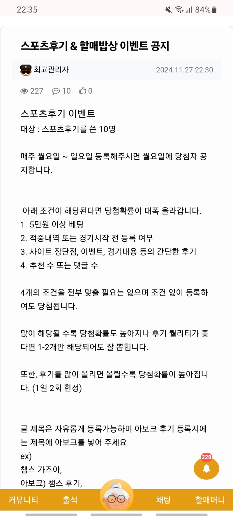 월요일 당첨자 공지한다고 돼있음 작성자 정보 켄트퍼플쪽지보내기 자기소개 닉네임으로 검색쪽지보내기 자기소개 닉네임으로 검색 작성 작성일 2024.12.01 22:36 컨텐츠 정보 186 조회 1 댓글 0 추천 목록 본문 일요일에 한다고 바뀜? 0 추천 관련자료 이전 무하은 사진도 봤으니 다시 토드컵 폐관 수련 드간다. 작성일 2024.12.01 22:36 다음 인생은 도박이다 취향 찾음 jpg 작성일 2024.12.01 22:34 댓글 1 로로랜드님의 댓글 로로랜드쪽지보내기 자기소개 닉네임으로 검색쪽지보내기 자기소개 닉네임으로 검색 작성일 2024.12.01 22:36 오호 오호 로그인한 회원만 댓글 등록이 가능합니다. 목록