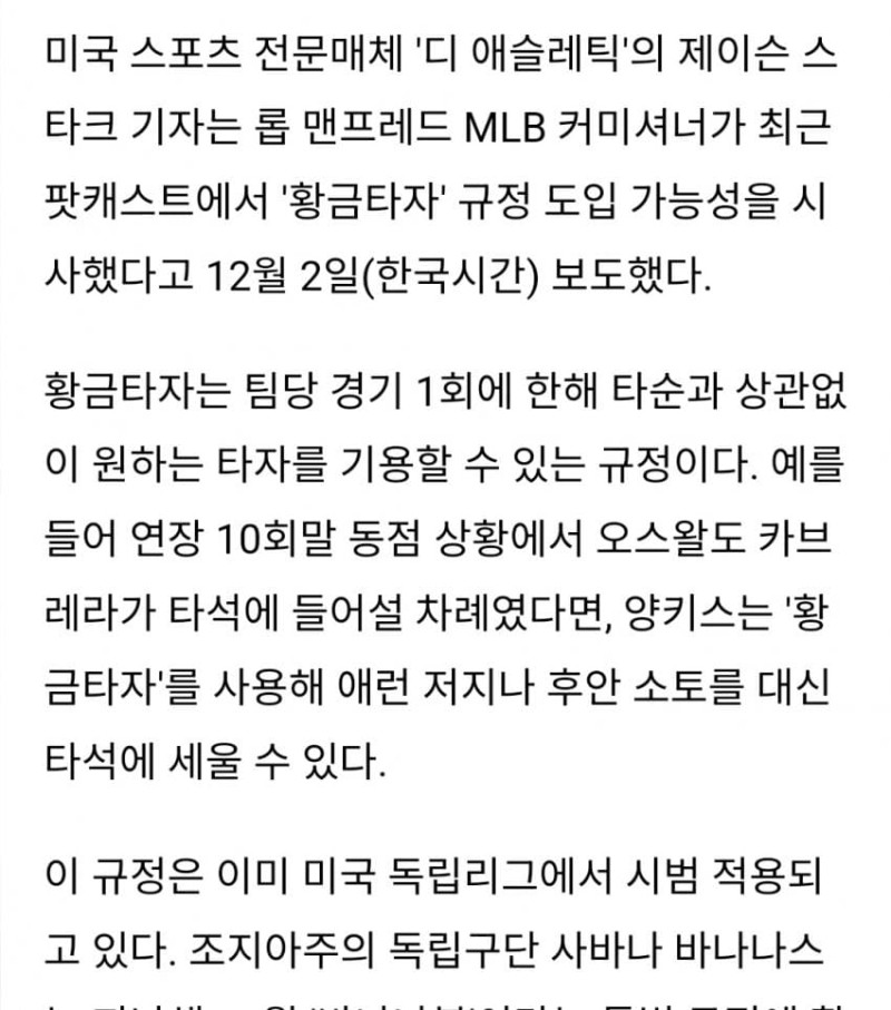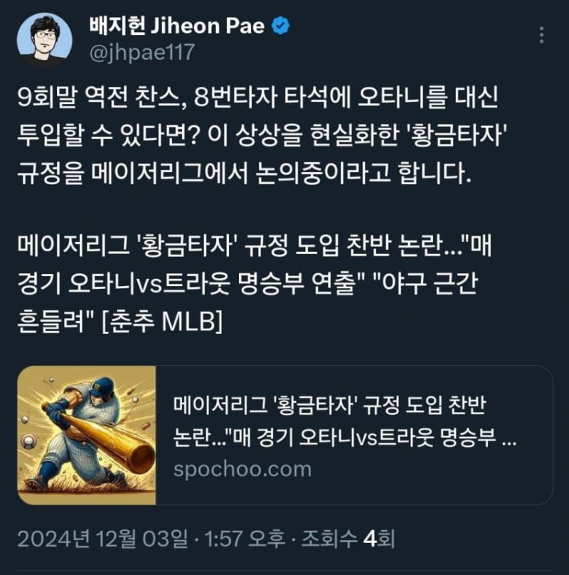속보) MLB 황금타자 룰 도입 작성자 정보 잘하는토붕이쪽지보내기 자기소개 닉네임으로 검색쪽지보내기 자기소개 닉네임으로 검색 작성 작성일 2024.12.03 14:04 컨텐츠 정보 125 조회 8 댓글 0 추천 목록 본문 미친 0 추천 관련자료 이전 보배 -2.5 맞나 3세트 쉬면서 줄수도있잖아 작성일 2024.12.03 14:12 다음 념글 삭제댔네 캡쳐는 했는데 당연히 작성일 2024.12.03 14:00 댓글 8 마당발님의 댓글 마당발쪽지보내기 자기소개 닉네임으로 검색쪽지보내기 자기소개 닉네임으로 검색 작성일 2024.12.03 14:05 바로 고의사구 바로 고의사구 달먹님의 댓글 달먹쪽지보내기 자기소개 닉네임으로 검색쪽지보내기 자기소개 닉네임으로 검색 작성일 2024.12.03 14:10 서커스를 만들려고하네!! 서커스를 만들려고하네!! 인생은도박이다님의 댓글 인생은도박이다쪽지보내기 자기소개 닉네임으로 검색쪽지보내기 자기소개 닉네임으로 검색 작성일 2024.12.03 14:24 재밌긴 할지도. 근데, 교체되는 선수는 무슨 죄냐? 재밌긴 할지도. 근데, 교체되는 선수는 무슨 죄냐? 인생은도박이다님의 댓글 인생은도박이다쪽지보내기 자기소개 닉네임으로 검색쪽지보내기 자기소개 닉네임으로 검색 작성일 2024.12.03 14:24 작명 촌스럽네. 황금박쥐도 아니고 작명 촌스럽네. 황금박쥐도 아니고 피닉스각선생님의 댓글 피닉스각선생쪽지보내기 자기소개 닉네임으로 검색쪽지보내기 자기소개 닉네임으로 검색 작성일 2024.12.03 14:33 레전드네 레전드네 켄트퍼플님의 댓글 켄트퍼플쪽지보내기 자기소개 닉네임으로 검색쪽지보내기 자기소개 닉네임으로 검색 작성일 2024.12.03 15:11 믈브잡종서커스 믈브잡종서커스 근본으로님의 댓글 근본으로쪽지보내기 자기소개 닉네임으로 검색쪽지보내기 자기소개 닉네임으로 검색 작성일 2024.12.03 21:52 레전드 레전드 독사님의 댓글 독사쪽지보내기 자기소개 닉네임으로 검색쪽지보내기 자기소개 닉네임으로 검색 작성일 2024.12.04 12:48 이건좀 이건좀 로그인한 회원만 댓글 등록이 가능합니다. 목록