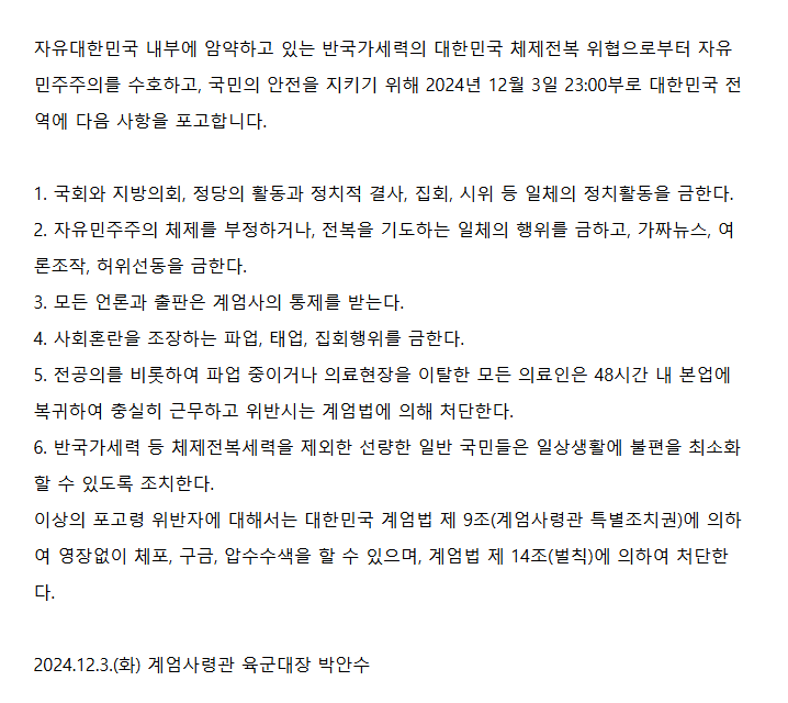 계엄사령부 포고령 작성자 정보 달먹쪽지보내기 자기소개 닉네임으로 검색쪽지보내기 자기소개 닉네임으로 검색 작성 작성일 2024.12.03 23:54 컨텐츠 정보 92 조회 7 댓글 0 추천 목록 본문 숙지해서 끌려가지 마라 0 추천 관련자료 이전 그나저나 트럼프 당선 후 주식 나락 작성일 2024.12.03 23:54 다음 계엄령 확대 vs축소 베팅열어주세요 작성일 2024.12.03 23:50 댓글 7 인생은도박이다님의 댓글 인생은도박이다쪽지보내기 자기소개 닉네임으로 검색쪽지보내기 자기소개 닉네임으로 검색 작성일 2024.12.04 00:01 다들 몸조심해라.... 지금은 저 군바리가 왕이다. 다들 몸조심해라.... 지금은 저 군바리가 왕이다. 토지노프2님의 댓글 토지노프2쪽지보내기 자기소개 닉네임으로 검색쪽지보내기 자기소개 닉네임으로 검색 작성일 2024.12.04 00:48 포고 ㄷㄷ 포고 ㄷㄷ 기커조님의 댓글 기커조쪽지보내기 자기소개 닉네임으로 검색쪽지보내기 자기소개 닉네임으로 검색 작성일 2024.12.04 00:55 무습다 ㄷ 무습다 ㄷ 두두님의 댓글 두두쪽지보내기 자기소개 닉네임으로 검색쪽지보내기 자기소개 닉네임으로 검색 작성일 2024.12.04 09:50 무섭다 무섭다 리을님의 댓글 리을쪽지보내기 자기소개 닉네임으로 검색쪽지보내기 자기소개 닉네임으로 검색 작성일 2024.12.04 14:33 무서워요 ㅠ 무서워요 ㅠ 독사님의 댓글 독사쪽지보내기 자기소개 닉네임으로 검색쪽지보내기 자기소개 닉네임으로 검색 작성일 2024.12.04 18:45 무습다 무습다 발암기억님의 댓글 발암기억쪽지보내기 자기소개 닉네임으로 검색쪽지보내기 자기소개 닉네임으로 검색 작성일 2024.12.04 23:26 와 이런게ㄷ 와 이런게ㄷ 로그인한 회원만 댓글 등록이 가능합니다. 목록