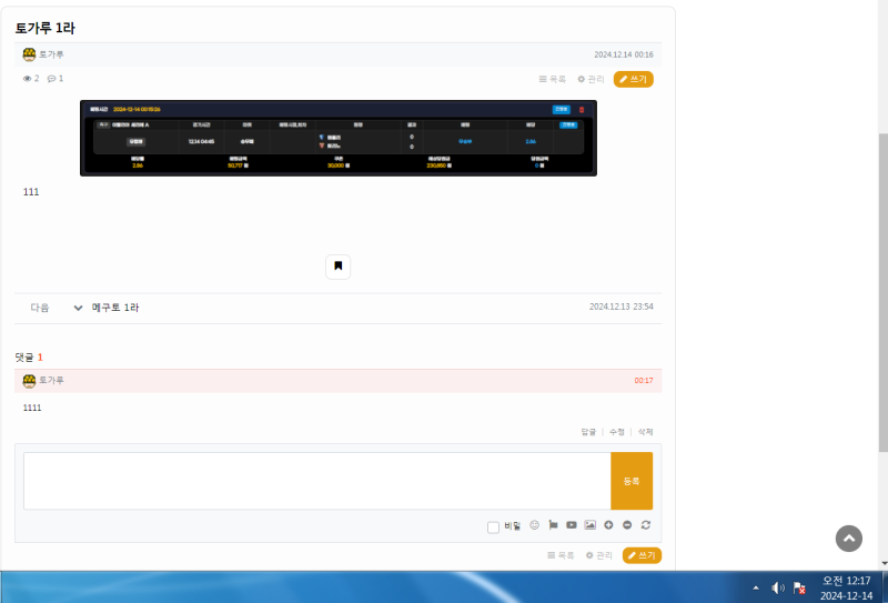 토드컵 인증용 작성자 정보 토가루쪽지보내기 자기소개 닉네임으로 검색쪽지보내기 자기소개 닉네임으로 검색 작성 작성일 2024.12.14 00:20 컨텐츠 정보 39 조회 6 댓글 0 추천 목록 관리 글검색 본문 정전시간대라서 인증용 남기니다 0 추천 관련자료 이전 토가루 할매밥상 작성일 2024.12.15 02:20 다음 할매밥상 토가루 작성일 2024.12.08 17:32 댓글 6 토가루님의 댓글 토가루쪽지보내기 자기소개 닉네임으로 검색쪽지보내기 자기소개 닉네임으로 검색 작성일 2024.12.14 00:20 1111 1111 켄트퍼플님의 댓글 켄트퍼플쪽지보내기 자기소개 닉네임으로 검색쪽지보내기 자기소개 닉네임으로 검색 작성일 2024.12.14 07:22 ㅠㅠ ㅠㅠ 토지노프2님의 댓글 토지노프2쪽지보내기 자기소개 닉네임으로 검색쪽지보내기 자기소개 닉네임으로 검색 작성일 2024.12.14 12:48 가즈아 가즈아 리을님의 댓글 리을쪽지보내기 자기소개 닉네임으로 검색쪽지보내기 자기소개 닉네임으로 검색 작성일 2024.12.14 15:21 조아요 조아요 독사님의 댓글 독사쪽지보내기 자기소개 닉네임으로 검색쪽지보내기 자기소개 닉네임으로 검색 작성일 2024.12.14 18:12 굿 굿 발암기억님의 댓글 발암기억쪽지보내기 자기소개 닉네임으로 검색쪽지보내기 자기소개 닉네임으로 검색 작성일 2024.12.14 23:23 조아 조아 로그인한 회원만 댓글 등록이 가능합니다. 목록 관리 글검색