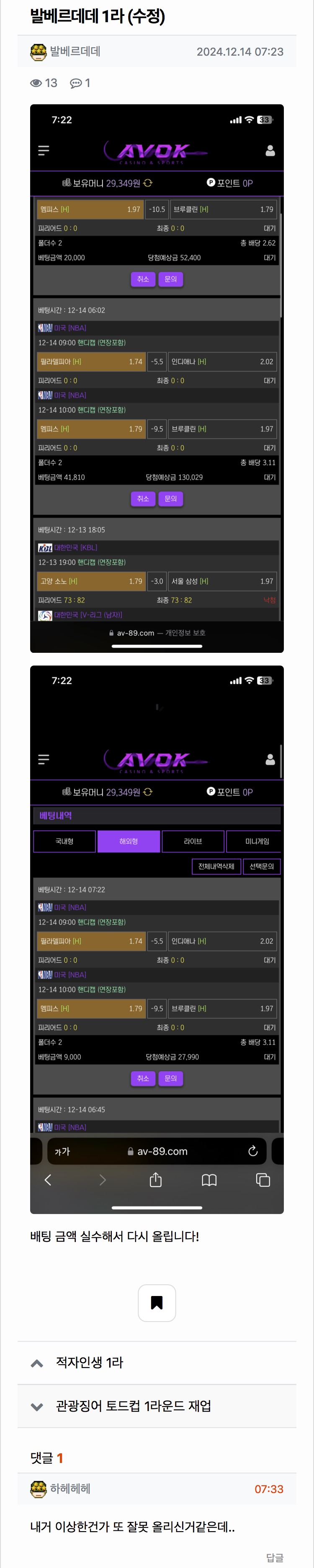 이분은 이건 뭐임ㅋㅋ 작성자 정보 각철쪽지보내기 자기소개 닉네임으로 검색쪽지보내기 자기소개 닉네임으로 검색 작성 작성일 2024.12.14 08:13 컨텐츠 정보 101 조회 11 댓글 0 추천 목록 본문 배팅금액 부족한 만큼 배팅해서 5만 맞추고있노 ㅋㅋㅋㅋㅋㅋㅋㅋㅋㅌ 0 추천 관련자료 이전 오 켄트퍼플 덴버갔구나 작성일 2024.12.14 08:18 다음 쫄병아 잘자라 안봐도 먹었다 작성일 2024.12.14 08:11 댓글 11 쫄병님의 댓글 쫄병쪽지보내기 자기소개 닉네임으로 검색쪽지보내기 자기소개 닉네임으로 검색 작성일 2024.12.14 08:15 저럼안되는거ㅣㅈ? 저럼안되는거ㅣㅈ? 각철님의 댓글의 댓글 각철쪽지보내기 자기소개 닉네임으로 검색쪽지보내기 자기소개 닉네임으로 검색 작성일 2024.12.14 08:17 걍 규정상 다 컷이 맞는듯 걍 규정상 다 컷이 맞는듯 쫄병님의 댓글의 댓글 쫄병쪽지보내기 자기소개 닉네임으로 검색쪽지보내기 자기소개 닉네임으로 검색 작성일 2024.12.14 08:20 저어어번에 누가저래서 남은거올렸는데 통과했던거같은데 저어어번에 누가저래서 남은거올렸는데 통과했던거같은데 각철님의 댓글의 댓글 각철쪽지보내기 자기소개 닉네임으로 검색쪽지보내기 자기소개 닉네임으로 검색 작성일 2024.12.14 08:23 그걸 통과 시키면 안됐.. 그걸 통과 시키면 안됐.. 일오칠님의 댓글 일오칠쪽지보내기 자기소개 닉네임으로 검색쪽지보내기 자기소개 닉네임으로 검색 작성일 2024.12.14 09:04 별 5개면 실수라고 보기도 애매한디.. 토드컵 이때까지라면서 항상 배팅금액 5만이상 고정이었는데 별 5개면 실수라고 보기도 애매한디.. 토드컵 이때까지라면서 항상 배팅금액 5만이상 고정이었는데 일오칠님의 댓글의 댓글 일오칠쪽지보내기 자기소개 닉네임으로 검색쪽지보내기 자기소개 닉네임으로 검색 작성일 2024.12.14 09:05 2라부터는 명시해야할듯.. 뭐라해야하려나 2라부터는 명시해야할듯.. 뭐라해야하려나 각철님의 댓글의 댓글 각철쪽지보내기 자기소개 닉네임으로 검색쪽지보내기 자기소개 닉네임으로 검색 작성일 2024.12.14 09:32 이미니와있음 5만이상 이미니와있음 5만이상 인생은도박이다님의 댓글 인생은도박이다쪽지보내기 자기소개 닉네임으로 검색쪽지보내기 자기소개 닉네임으로 검색 작성일 2024.12.14 09:42 흠좀무 덜덜덜 흠좀무 덜덜덜 토지노프2님의 댓글 토지노프2쪽지보내기 자기소개 닉네임으로 검색쪽지보내기 자기소개 닉네임으로 검색 작성일 2024.12.14 13:04 무습네 무습네 리을님의 댓글 리을쪽지보내기 자기소개 닉네임으로 검색쪽지보내기 자기소개 닉네임으로 검색 작성일 2024.12.14 15:48 아이고 왜그래셨을까 아이고 왜그래셨을까 발암기억님의 댓글 발암기억쪽지보내기 자기소개 닉네임으로 검색쪽지보내기 자기소개 닉네임으로 검색 작성일 2024.12.14 23:40 실격 실격 로그인한 회원만 댓글 등록이 가능합니다. 목록