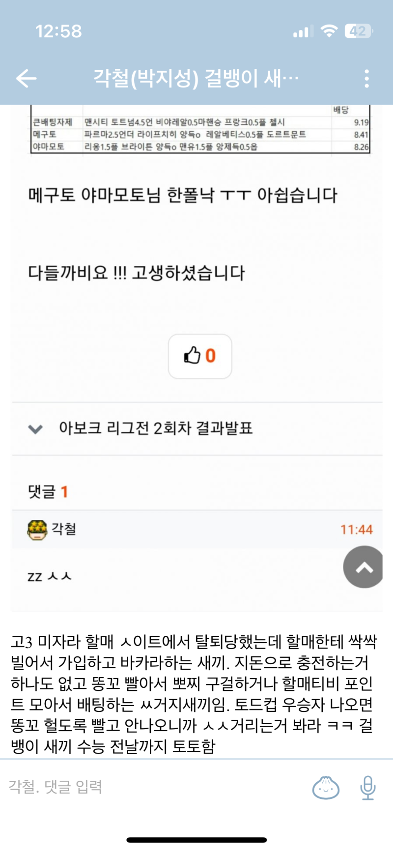 누군지 알지만 화이팅하십쇼 작성자 정보 각철쪽지보내기 자기소개 닉네임으로 검색쪽지보내기 자기소개 닉네임으로 검색 작성 작성일 2024.12.16 12:59 컨텐츠 정보 95 조회 5 댓글 0 추천 목록 본문 와우... 0 추천 관련자료 이전 13배인데 명전이되네 ㅅㅅ 작성일 2024.12.16 13:03 다음 어제 랄승 공짜라 했습니다 작성일 2024.12.16 12:40 댓글 5 달먹님의 댓글 달먹쪽지보내기 자기소개 닉네임으로 검색쪽지보내기 자기소개 닉네임으로 검색 작성일 2024.12.16 13:00 동강이니???ㅋㅋ 동강이니???ㅋㅋ 김배틀님의 댓글 김배틀쪽지보내기 자기소개 닉네임으로 검색쪽지보내기 자기소개 닉네임으로 검색 작성일 2024.12.16 13:02 진짜 ㅂㅅ새기들 많은듯 요즘 진짜 ㅂㅅ새기들 많은듯 요즘 인생은도박이다님의 댓글 인생은도박이다쪽지보내기 자기소개 닉네임으로 검색쪽지보내기 자기소개 닉네임으로 검색 작성일 2024.12.16 13:29 저번에 챗창에서 어그로 끌던 색히네 ㄷㄷㄷ 저번에 챗창에서 어그로 끌던 색히네 ㄷㄷㄷ 대수성님의 댓글 대수성쪽지보내기 자기소개 닉네임으로 검색쪽지보내기 자기소개 닉네임으로 검색 작성일 2024.12.16 13:48 아 걔네 아 걔네 리을님의 댓글 리을쪽지보내기 자기소개 닉네임으로 검색쪽지보내기 자기소개 닉네임으로 검색 작성일 2024.12.16 20:01 뭐하는놈이여 뭐하는놈이여 로그인한 회원만 댓글 등록이 가능합니다. 목록