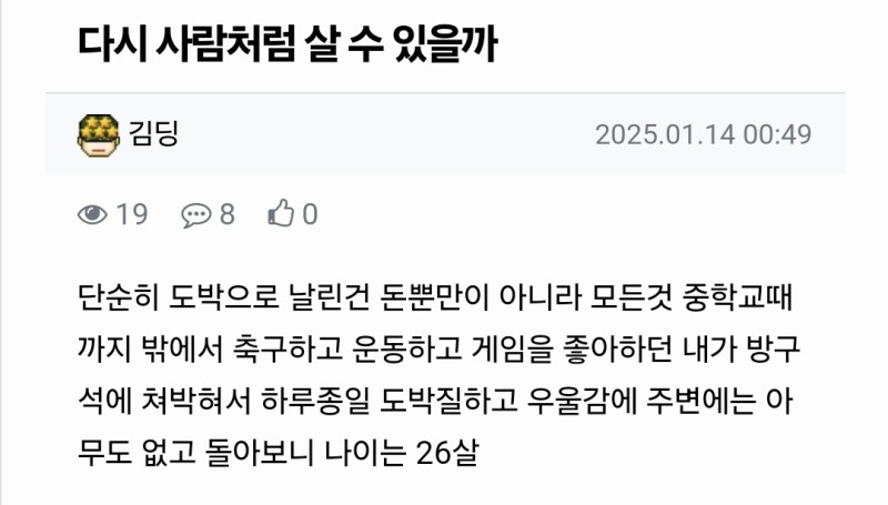 요즘 그리운 사람 (고인) 작성자 정보 독사쪽지보내기 자기소개 닉네임으로 검색쪽지보내기 자기소개 닉네임으로 검색 작성 작성일 2025.02.26 16:38 컨텐츠 정보 59 조회 8 댓글 0 추천 목록 본문 김딩 0 추천 관련자료 이전 요즘 조사받은 사람 작성일 2025.02.26 16:40 다음 한국 갈까말까 고민되네 작성일 2025.02.26 16:38 댓글 8 마당발님의 댓글 마당발쪽지보내기 자기소개 닉네임으로 검색쪽지보내기 자기소개 닉네임으로 검색 작성일 2025.02.26 16:49 딩디기딩딩 딩디기딩딩 먼짝귀1111님의 댓글 먼짝귀1111쪽지보내기 자기소개 닉네임으로 검색쪽지보내기 자기소개 닉네임으로 검색 작성일 2025.02.26 16:54 공무원 되야징 공무원 되야징 기커조님의 댓글 기커조쪽지보내기 자기소개 닉네임으로 검색쪽지보내기 자기소개 닉네임으로 검색 작성일 2025.02.26 17:29 그립네 그립네 스테판커쇼님의 댓글 스테판커쇼쪽지보내기 자기소개 닉네임으로 검색쪽지보내기 자기소개 닉네임으로 검색 작성일 2025.02.26 17:52 화이팅 화이팅 켄트퍼플님의 댓글 켄트퍼플쪽지보내기 자기소개 닉네임으로 검색쪽지보내기 자기소개 닉네임으로 검색 작성일 2025.02.26 19:41 ㅋㅋㅋ ㅋㅋㅋ 두두님의 댓글 두두쪽지보내기 자기소개 닉네임으로 검색쪽지보내기 자기소개 닉네임으로 검색 작성일 2025.02.26 20:31 그립 ㄷ 그립 ㄷ 발암기억님의 댓글 발암기억쪽지보내기 자기소개 닉네임으로 검색쪽지보내기 자기소개 닉네임으로 검색 작성일 2025.02.27 10:47 가즈아 가즈아 달먹님의 댓글 달먹쪽지보내기 자기소개 닉네임으로 검색쪽지보내기 자기소개 닉네임으로 검색 작성일 2025.02.27 13:23 정상에서만나자 정상에서만나자 로그인한 회원만 댓글 등록이 가능합니다. 목록