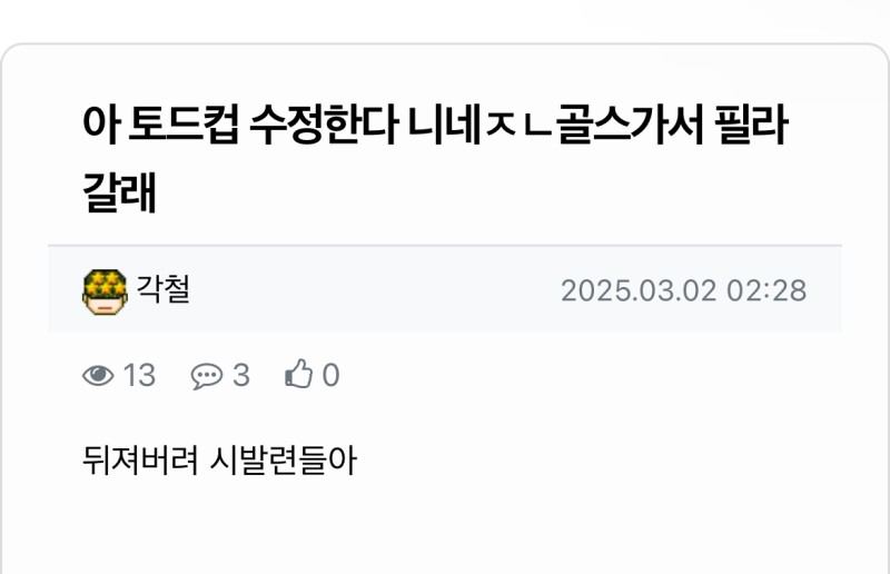각철 안바꿨으면 적중이네 작성자 정보 연린쪽지보내기 자기소개 닉네임으로 검색쪽지보내기 자기소개 닉네임으로 검색 작성 작성일 2025.03.02 12:27 컨텐츠 정보 46 조회 9 댓글 0 추천 목록 본문 바꾸고 개가치낙ㅋㅋㅋㅋㅋㅋ 0 추천 관련자료 이전 자잭주 3333개씨1발련아 ㅅㅅㅅㅅㅅㅅㅅ 작성일 2025.03.02 12:27 다음 그와중에 수정전 토드컵2라픽은 적중이네 시발 작성일 2025.03.02 12:26 댓글 9 각철님의 댓글 각철쪽지보내기 자기소개 닉네임으로 검색쪽지보내기 자기소개 닉네임으로 검색 작성일 2025.03.02 12:27 진짜 자살마렵다 진짜 자살마렵다 연린님의 댓글의 댓글 연린쪽지보내기 자기소개 닉네임으로 검색쪽지보내기 자기소개 닉네임으로 검색 작성일 2025.03.02 12:30 팍스 버저비터 팍스 버저비터 마당발님의 댓글 마당발쪽지보내기 자기소개 닉네임으로 검색쪽지보내기 자기소개 닉네임으로 검색 작성일 2025.03.02 12:40 까비네 까비네 달먹님의 댓글 달먹쪽지보내기 자기소개 닉네임으로 검색쪽지보내기 자기소개 닉네임으로 검색 작성일 2025.03.02 14:14 아까비 아까비 두두님의 댓글 두두쪽지보내기 자기소개 닉네임으로 검색쪽지보내기 자기소개 닉네임으로 검색 작성일 2025.03.02 14:28 와까비 와까비 기커조님의 댓글 기커조쪽지보내기 자기소개 닉네임으로 검색쪽지보내기 자기소개 닉네임으로 검색 작성일 2025.03.02 14:57 덜덜 덜덜 먼짝귀1111님의 댓글 먼짝귀1111쪽지보내기 자기소개 닉네임으로 검색쪽지보내기 자기소개 닉네임으로 검색 작성일 2025.03.02 18:07 까빙 까빙 스테판커쇼님의 댓글 스테판커쇼쪽지보내기 자기소개 닉네임으로 검색쪽지보내기 자기소개 닉네임으로 검색 작성일 2025.03.02 18:14 후덜덜 후덜덜 발베르데데님의 댓글 발베르데데쪽지보내기 자기소개 닉네임으로 검색쪽지보내기 자기소개 닉네임으로 검색 작성일 2025.03.03 10:55 ㄲㅂ ㄲㅂ 로그인한 회원만 댓글 등록이 가능합니다. 목록