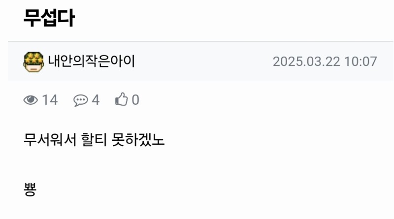 무서워서 할티 못하겠노. 작성자 정보 독사쪽지보내기 자기소개 닉네임으로 검색쪽지보내기 자기소개 닉네임으로 검색 작성 작성일 2025.03.24 10:20 컨텐츠 정보 70 조회 8 댓글 0 추천 목록 본문 뿅 0 추천 관련자료 이전 먼시 동점 홈런 작성일 2025.03.24 10:21 다음 다쟈스 매회 위기 작성일 2025.03.24 10:15 댓글 8 스테판커쇼님의 댓글 스테판커쇼쪽지보내기 자기소개 닉네임으로 검색쪽지보내기 자기소개 닉네임으로 검색 작성일 2025.03.24 10:22 후덜덜 후덜덜 먼짝귀1111님의 댓글 먼짝귀1111쪽지보내기 자기소개 닉네임으로 검색쪽지보내기 자기소개 닉네임으로 검색 작성일 2025.03.24 10:33 뿅 뿅 인생은도박이다님의 댓글 인생은도박이다쪽지보내기 자기소개 닉네임으로 검색쪽지보내기 자기소개 닉네임으로 검색 작성일 2025.03.24 10:48 잘만 하더만 으이! 잘만 하더만 으이! 마당발님의 댓글 마당발쪽지보내기 자기소개 닉네임으로 검색쪽지보내기 자기소개 닉네임으로 검색 작성일 2025.03.24 10:49 무습다 무습다 기커조님의 댓글 기커조쪽지보내기 자기소개 닉네임으로 검색쪽지보내기 자기소개 닉네임으로 검색 작성일 2025.03.24 10:59 덜덜 덜덜 켄트퍼플님의 댓글 켄트퍼플쪽지보내기 자기소개 닉네임으로 검색쪽지보내기 자기소개 닉네임으로 검색 작성일 2025.03.24 14:42 덜덜 덜덜 달먹님의 댓글 달먹쪽지보내기 자기소개 닉네임으로 검색쪽지보내기 자기소개 닉네임으로 검색 작성일 2025.03.24 14:47 역시 내작아 역시 내작아 두두님의 댓글 두두쪽지보내기 자기소개 닉네임으로 검색쪽지보내기 자기소개 닉네임으로 검색 작성일 2025.03.24 20:23 무서워 무서워 로그인한 회원만 댓글 등록이 가능합니다. 목록