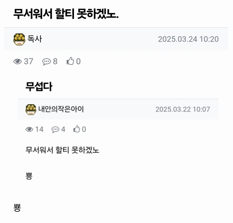 무서워서 할티 못하겠노. 작성자 정보 독사쪽지보내기 자기소개 닉네임으로 검색쪽지보내기 자기소개 닉네임으로 검색 작성 작성일 2025.03.26 00:38 컨텐츠 정보 50 조회 8 댓글 0 추천 목록 본문 뿅 0 추천 관련자료 이전 무서워서 할티 못하겠노. 작성일 2025.03.26 00:39 다음 감자전에 간장 찍어먹으면 맛도리인데 작성일 2025.03.26 00:37 댓글 8 내안의작은아이님의 댓글 내안의작은아이쪽지보내기 자기소개 닉네임으로 검색쪽지보내기 자기소개 닉네임으로 검색 작성일 2025.03.26 00:39 줜나 무섭노 뿅 줜나 무섭노 뿅 김배틀님의 댓글 김배틀쪽지보내기 자기소개 닉네임으로 검색쪽지보내기 자기소개 닉네임으로 검색 작성일 2025.03.26 00:44 무서워요 무서워요 기커조님의 댓글 기커조쪽지보내기 자기소개 닉네임으로 검색쪽지보내기 자기소개 닉네임으로 검색 작성일 2025.03.26 00:46 무섭다 무섭다 달먹님의 댓글 달먹쪽지보내기 자기소개 닉네임으로 검색쪽지보내기 자기소개 닉네임으로 검색 작성일 2025.03.26 14:19 내작아 화이팅 내작아 화이팅 마당발님의 댓글 마당발쪽지보내기 자기소개 닉네임으로 검색쪽지보내기 자기소개 닉네임으로 검색 작성일 2025.03.26 14:58 레알 레알 먼짝귀1111님의 댓글 먼짝귀1111쪽지보내기 자기소개 닉네임으로 검색쪽지보내기 자기소개 닉네임으로 검색 작성일 2025.03.26 17:06 뿅 뿅 켄트퍼플님의 댓글 켄트퍼플쪽지보내기 자기소개 닉네임으로 검색쪽지보내기 자기소개 닉네임으로 검색 작성일 2025.03.26 23:11 덜덜 덜덜 스테판커쇼님의 댓글 스테판커쇼쪽지보내기 자기소개 닉네임으로 검색쪽지보내기 자기소개 닉네임으로 검색 작성일 2025.03.27 04:11 후덜덜 후덜덜 로그인한 회원만 댓글 등록이 가능합니다. 목록