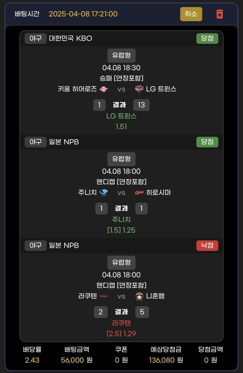취소잼 작성자 정보 안걸림쪽지보내기 자기소개 닉네임으로 검색쪽지보내기 자기소개 닉네임으로 검색 작성 작성일 2025.04.08 22:06 컨텐츠 정보 60 조회 7 댓글 0 추천 목록 관리 글검색 본문 2.5배 안돼서 바로 취소 잘했다 0 추천 관련자료 이전 내일 다저스 경기 작성일 2025.04.08 22:49 다음 스후 당첨 작성일 2025.04.07 18:44 댓글 7 내안의작은아이님의 댓글 내안의작은아이쪽지보내기 자기소개 닉네임으로 검색쪽지보내기 자기소개 닉네임으로 검색 작성일 2025.04.08 22:07 삼삼오입으로 2.5배 인정해드립니다 삼삼오입으로 2.5배 인정해드립니다 마당발님의 댓글 마당발쪽지보내기 자기소개 닉네임으로 검색쪽지보내기 자기소개 닉네임으로 검색 작성일 2025.04.08 22:11 오 굿 오 굿 기커조님의 댓글 기커조쪽지보내기 자기소개 닉네임으로 검색쪽지보내기 자기소개 닉네임으로 검색 작성일 2025.04.08 22:14 다행이네 다행이네 켄트퍼플님의 댓글 켄트퍼플쪽지보내기 자기소개 닉네임으로 검색쪽지보내기 자기소개 닉네임으로 검색 작성일 2025.04.08 23:56 굿굿 굿굿 발암기억님의 댓글 발암기억쪽지보내기 자기소개 닉네임으로 검색쪽지보내기 자기소개 닉네임으로 검색 작성일 2025.04.09 12:21 다행 다행 달먹님의 댓글 달먹쪽지보내기 자기소개 닉네임으로 검색쪽지보내기 자기소개 닉네임으로 검색 작성일 2025.04.09 17:15 야호 야호 토지노프2님의 댓글 토지노프2쪽지보내기 자기소개 닉네임으로 검색쪽지보내기 자기소개 닉네임으로 검색 작성일 2025.04.09 21:16 다행ㅋㅋ 다행ㅋㅋ 로그인한 회원만 댓글 등록이 가능합니다. 목록 관리 글검색
