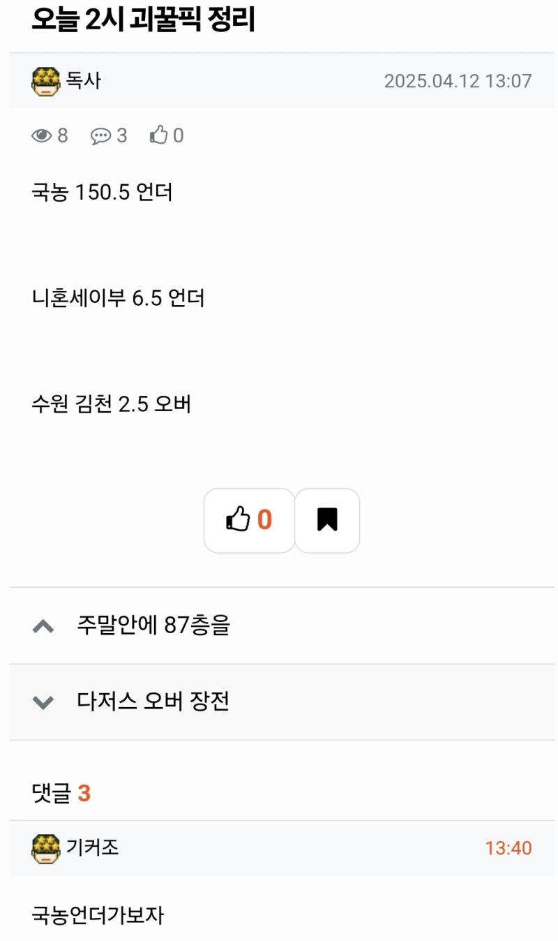 [적중] 2시 경기 올킬대기 작성자 정보 독사쪽지보내기 자기소개 닉네임으로 검색쪽지보내기 자기소개 닉네임으로 검색 작성 작성일 2025.04.12 16:03 컨텐츠 정보 42 조회 9 댓글 0 추천 목록 본문 어데 갔냐공 ㄷㅅ 0 추천 관련자료 이전 강승호는 음주운전하고도 작성일 2025.04.12 16:04 다음 와 케이티 저걸 작성일 2025.04.12 16:01 댓글 9 기커조님의 댓글 기커조쪽지보내기 자기소개 닉네임으로 검색쪽지보내기 자기소개 닉네임으로 검색 작성일 2025.04.12 16:34 국농먹었다 ㅅㅅ 국농먹었다 ㅅㅅ 두두님의 댓글 두두쪽지보내기 자기소개 닉네임으로 검색쪽지보내기 자기소개 닉네임으로 검색 작성일 2025.04.12 18:32 올킬 ㄷ 올킬 ㄷ 토지노프2님의 댓글 토지노프2쪽지보내기 자기소개 닉네임으로 검색쪽지보내기 자기소개 닉네임으로 검색 작성일 2025.04.12 19:10 올킬ㅊ 올킬ㅊ 스테판커쇼님의 댓글 스테판커쇼쪽지보내기 자기소개 닉네임으로 검색쪽지보내기 자기소개 닉네임으로 검색 작성일 2025.04.12 19:57 가즈아 가즈아 켄트퍼플님의 댓글 켄트퍼플쪽지보내기 자기소개 닉네임으로 검색쪽지보내기 자기소개 닉네임으로 검색 작성일 2025.04.13 00:25 가즈아 가즈아 발암기억님의 댓글 발암기억쪽지보내기 자기소개 닉네임으로 검색쪽지보내기 자기소개 닉네임으로 검색 작성일 2025.04.13 09:45 적중 적중 마당발님의 댓글 마당발쪽지보내기 자기소개 닉네임으로 검색쪽지보내기 자기소개 닉네임으로 검색 작성일 2025.04.13 11:50 꿀 꿀 먼짝귀1111님의 댓글 먼짝귀1111쪽지보내기 자기소개 닉네임으로 검색쪽지보내기 자기소개 닉네임으로 검색 작성일 2025.04.13 13:49 샤샤 샤샤 맞추고싶어님의 댓글 맞추고싶어쪽지보내기 자기소개 닉네임으로 검색쪽지보내기 자기소개 닉네임으로 검색 작성일 2025.04.13 15:07 축하 축하 로그인한 회원만 댓글 등록이 가능합니다. 목록