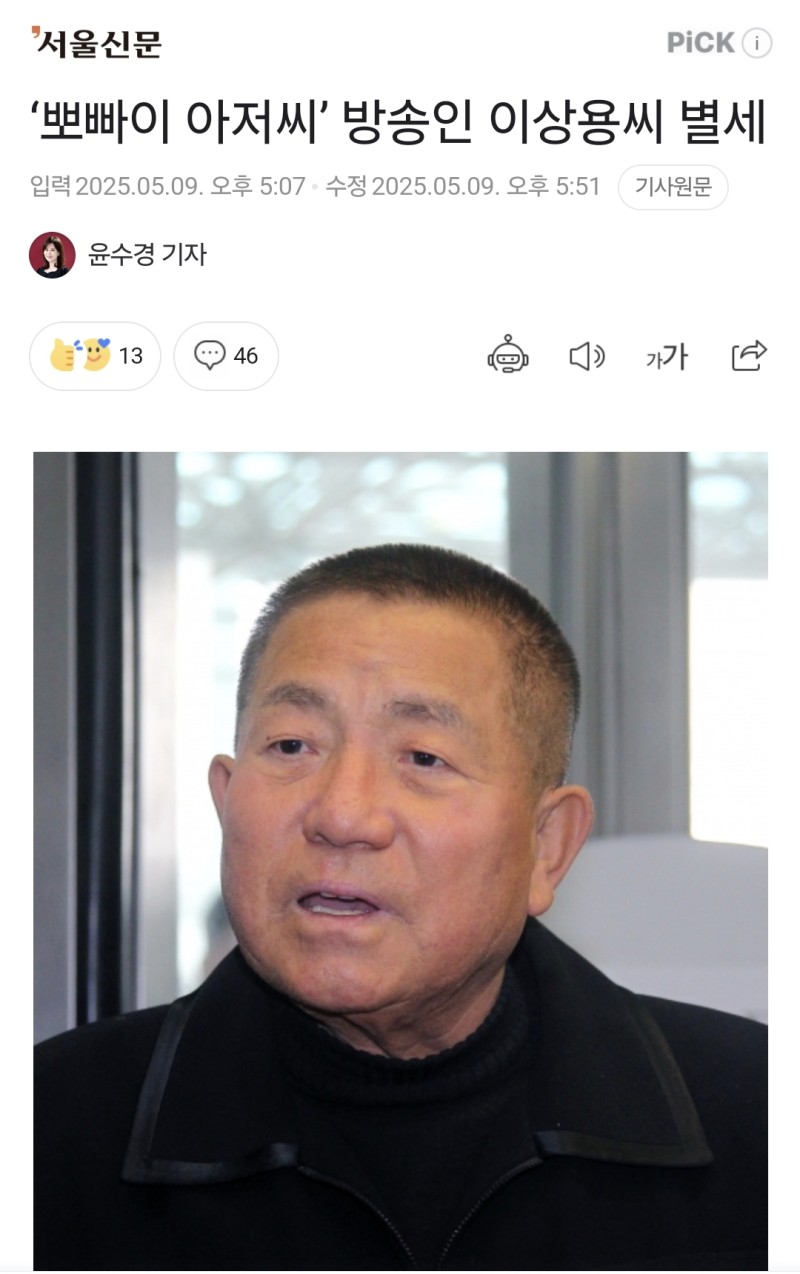 뽀빠이 행님 마 만다꼬 일찍 저세상으로 가부렀소 작성자 정보 독사쪽지보내기 자기소개 닉네임으로 검색쪽지보내기 자기소개 닉네임으로 검색 작성 작성일 2025.05.09 18:07 컨텐츠 정보 60 조회 7 댓글 0 추천 목록 본문 나가 35년전쯤에 우정의 무대 나가서 어무이 찾아볼람서 신청했었는디 퇴짜마즌 기억이 새록새록 나네 (새복아님) 0 추천 관련자료 이전 레알 사비알론솓ㄷㄷㄷ 작성일 2025.05.09 18:09 다음 문수가 가처분 기각당해부러서 진퇴유곡에 놓인기 작성일 2025.05.09 18:05 댓글 7 마당발님의 댓글 마당발쪽지보내기 자기소개 닉네임으로 검색쪽지보내기 자기소개 닉네임으로 검색 작성일 2025.05.09 18:14 헐 헐 새벽복숭아님의 댓글 새벽복숭아쪽지보내기 자기소개 닉네임으로 검색쪽지보내기 자기소개 닉네임으로 검색 작성일 2025.05.09 18:16 헉 헉 기커조님의 댓글 기커조쪽지보내기 자기소개 닉네임으로 검색쪽지보내기 자기소개 닉네임으로 검색 작성일 2025.05.09 19:34 삼가고인의 명복을빕니다 삼가고인의 명복을빕니다 두두님의 댓글 두두쪽지보내기 자기소개 닉네임으로 검색쪽지보내기 자기소개 닉네임으로 검색 작성일 2025.05.09 20:11 누구노 누구노 스테판커쇼님의 댓글 스테판커쇼쪽지보내기 자기소개 닉네임으로 검색쪽지보내기 자기소개 닉네임으로 검색 작성일 2025.05.10 07:27 할 할 토지노프2님의 댓글 토지노프2쪽지보내기 자기소개 닉네임으로 검색쪽지보내기 자기소개 닉네임으로 검색 작성일 2025.05.10 10:40 사망ㄷ 사망ㄷ 켄트퍼플님의 댓글 켄트퍼플쪽지보내기 자기소개 닉네임으로 검색쪽지보내기 자기소개 닉네임으로 검색 작성일 2025.05.10 16:12 슬퍼요 슬퍼요 로그인한 회원만 댓글 등록이 가능합니다. 목록