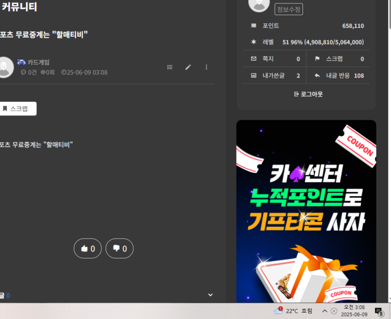 홍보왕 카드게임 6/9 작성자 정보 카드게임쪽지보내기 자기소개 닉네임으로 검색쪽지보내기 자기소개 닉네임으로 검색 작성 작성일 2025.06.09 03:09 컨텐츠 정보 34 조회 9 댓글 0 추천 목록 본문 숙 완! 0 추천 관련자료 이전 클블 투런 ㅅㅅㅅ 작성일 2025.06.09 03:10 다음 늦잠자서 피츠언더를 못갔네 작성일 2025.06.09 03:08 댓글 9 스테판커쇼님의 댓글 스테판커쇼쪽지보내기 자기소개 닉네임으로 검색쪽지보내기 자기소개 닉네임으로 검색 작성일 2025.06.09 11:59 화이팅 화이팅 뜌류님의 댓글 뜌류쪽지보내기 자기소개 닉네임으로 검색쪽지보내기 자기소개 닉네임으로 검색 작성일 2025.06.09 15:22 홍보 홍보 마당발님의 댓글 마당발쪽지보내기 자기소개 닉네임으로 검색쪽지보내기 자기소개 닉네임으로 검색 작성일 2025.06.09 16:49 굿 굿 기커조님의 댓글 기커조쪽지보내기 자기소개 닉네임으로 검색쪽지보내기 자기소개 닉네임으로 검색 작성일 2025.06.09 19:03 홍보 ㅅ 홍보 ㅅ 토지노프2님의 댓글 토지노프2쪽지보내기 자기소개 닉네임으로 검색쪽지보내기 자기소개 닉네임으로 검색 작성일 2025.06.09 19:04 미션ㅅ 미션ㅅ 켄트퍼플님의 댓글 켄트퍼플쪽지보내기 자기소개 닉네임으로 검색쪽지보내기 자기소개 닉네임으로 검색 작성일 2025.06.09 19:29 좋아요 좋아요 발암기억님의 댓글 발암기억쪽지보내기 자기소개 닉네임으로 검색쪽지보내기 자기소개 닉네임으로 검색 작성일 2025.06.09 21:11 덜덜 덜덜 두두님의 댓글 두두쪽지보내기 자기소개 닉네임으로 검색쪽지보내기 자기소개 닉네임으로 검색 작성일 2025.06.09 23:15 홍카 홍카 달먹님의 댓글 달먹쪽지보내기 자기소개 닉네임으로 검색쪽지보내기 자기소개 닉네임으로 검색 작성일 2025.06.10 01:05 하이팅 하이팅 로그인한 회원만 댓글 등록이 가능합니다. 목록