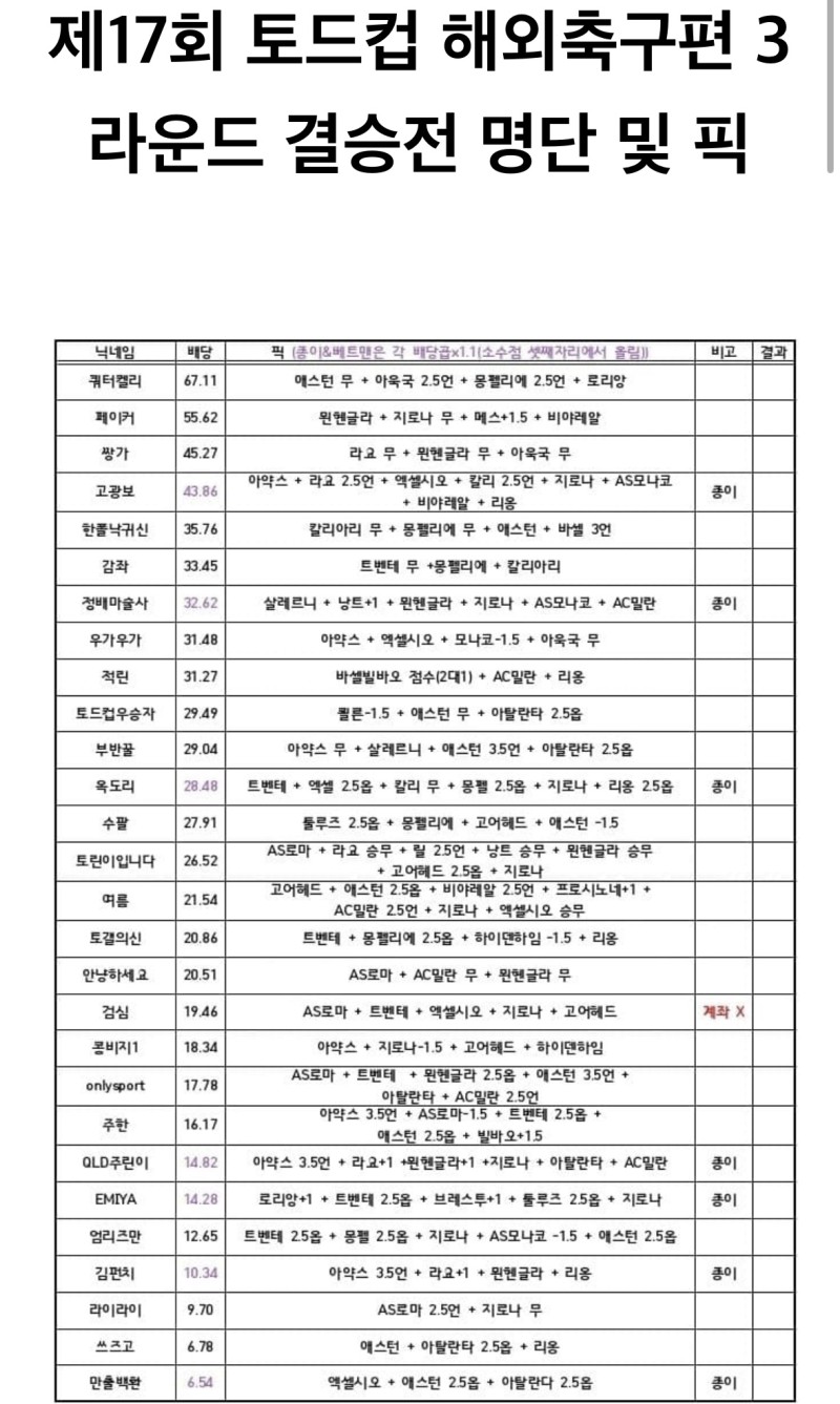 토드컵 3라 진출자 28명 작성자 정보 맨날적자야쪽지보내기 자기소개 닉네임으로 검색쪽지보내기 자기소개 닉네임으로 검색 작성 작성일 2025.06.11 17:30 컨텐츠 정보 106 조회 4 댓글 0 추천 목록 관리 글검색 본문 나도 저때 참여했었는데 옛날엔 진짜 우승확률 개빡셋네 0 추천 관련자료 이전 다른 적자님도 5승 실패 하셨군... 작성일 2025.06.14 17:48 다음 토드컵 3라 진출자 31명 작성일 2025.06.11 17:25 댓글 4 인생은도박이다님의 댓글 인생은도박이다쪽지보내기 자기소개 닉네임으로 검색쪽지보내기 자기소개 닉네임으로 검색 작성일 2025.06.11 19:22 후달달 후달달 마당발님의 댓글 마당발쪽지보내기 자기소개 닉네임으로 검색쪽지보내기 자기소개 닉네임으로 검색 작성일 2025.06.11 21:44 많다 많다 참이슬님의 댓글 참이슬쪽지보내기 자기소개 닉네임으로 검색쪽지보내기 자기소개 닉네임으로 검색 작성일 2025.06.12 05:40 대박 대박 야밀리야미님의 댓글 야밀리야미쪽지보내기 자기소개 닉네임으로 검색쪽지보내기 자기소개 닉네임으로 검색 작성일 2025.06.12 16:59 많네요 많네요 로그인한 회원만 댓글 등록이 가능합니다. 목록 관리 글검색