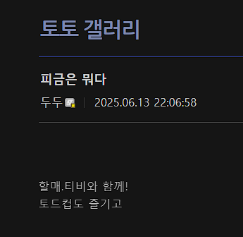 두두 홍보왕 작성자 정보 두두쪽지보내기 자기소개 닉네임으로 검색쪽지보내기 자기소개 닉네임으로 검색 작성 작성일 2025.06.13 22:10 컨텐츠 정보 80 조회 6 댓글 0 추천 목록 관리 글검색 본문 토갤 네이버 0 추천 관련자료 이전 오늘 야구 우취 작성일 2025.06.13 22:11 다음 할티출근 작성일 2025.06.13 22:09 댓글 6 마당발님의 댓글 마당발쪽지보내기 자기소개 닉네임으로 검색쪽지보내기 자기소개 닉네임으로 검색 작성일 2025.06.13 22:15 굿 굿 스테판커쇼님의 댓글 스테판커쇼쪽지보내기 자기소개 닉네임으로 검색쪽지보내기 자기소개 닉네임으로 검색 작성일 2025.06.13 22:53 화이팅 화이팅 참이슬님의 댓글 참이슬쪽지보내기 자기소개 닉네임으로 검색쪽지보내기 자기소개 닉네임으로 검색 작성일 2025.06.14 07:29 홍보 홍보 기커조님의 댓글 기커조쪽지보내기 자기소개 닉네임으로 검색쪽지보내기 자기소개 닉네임으로 검색 작성일 2025.06.14 11:39 홍보 ㅅ 홍보 ㅅ 두두님의 댓글의 댓글 두두쪽지보내기 자기소개 닉네임으로 검색쪽지보내기 자기소개 닉네임으로 검색 작성일 2025.06.14 17:52 완료 완료 제이덥님의 댓글 제이덥쪽지보내기 자기소개 닉네임으로 검색쪽지보내기 자기소개 닉네임으로 검색 작성일 2025.06.16 16:45 홍보 홍보 로그인한 회원만 댓글 등록이 가능합니다. 목록 관리 글검색