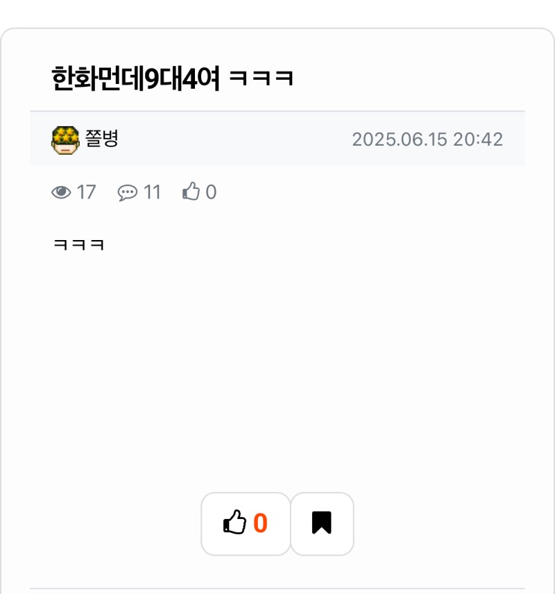 쫄병사라진이유분석 작성자 정보 뜌류쪽지보내기 자기소개 닉네임으로 검색쪽지보내기 자기소개 닉네임으로 검색 작성 작성일 2025.06.16 22:54 컨텐츠 정보 46 조회 6 댓글 0 추천 목록 관리 글검색 본문 한화의 33년만에 69경기 1위탈환으로 기쁨을만끽하며 라스 새로고침하다 심장마비추정 0 추천 관련자료 이전 쫄병사라진이유분석2 작성일 2025.06.16 22:55 다음 로로티비 창립 선언 ㄷㄷ 작성일 2025.06.16 22:34 댓글 6 인생은도박이다님의 댓글 인생은도박이다쪽지보내기 자기소개 닉네임으로 검색쪽지보내기 자기소개 닉네임으로 검색 작성일 2025.06.16 22:55 삼고빔 삼고빔 달먹님의 댓글 달먹쪽지보내기 자기소개 닉네임으로 검색쪽지보내기 자기소개 닉네임으로 검색 작성일 2025.06.17 15:36 한화야 한화야 먼짝귀1111님의 댓글 먼짝귀1111쪽지보내기 자기소개 닉네임으로 검색쪽지보내기 자기소개 닉네임으로 검색 작성일 2025.06.17 17:31 안됑 안됑 기커조님의 댓글 기커조쪽지보내기 자기소개 닉네임으로 검색쪽지보내기 자기소개 닉네임으로 검색 작성일 2025.06.17 19:30 후덜덜 후덜덜 두두님의 댓글 두두쪽지보내기 자기소개 닉네임으로 검색쪽지보내기 자기소개 닉네임으로 검색 작성일 2025.06.17 21:48 옳다 옳다 켄트퍼플님의 댓글 켄트퍼플쪽지보내기 자기소개 닉네임으로 검색쪽지보내기 자기소개 닉네임으로 검색 작성일 2025.06.17 21:49 덜덜 덜덜 로그인한 회원만 댓글 등록이 가능합니다. 목록 관리 글검색
