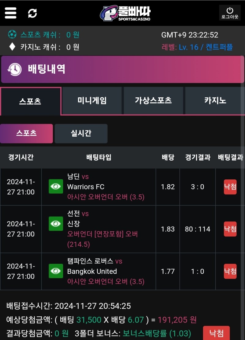 국내경기 낙되고 복구해볼라고 배팅했는데 개같이 역올킬 했습니다. ㅅㅅㅅ