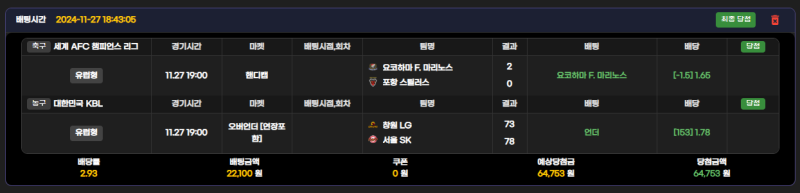요코하마가 95분에 PK골을 넣고 포항이 90분에 PK 수지하면서 겨우 -1.5핸디 먹었네요. 정신 나가는줄 알았네요.