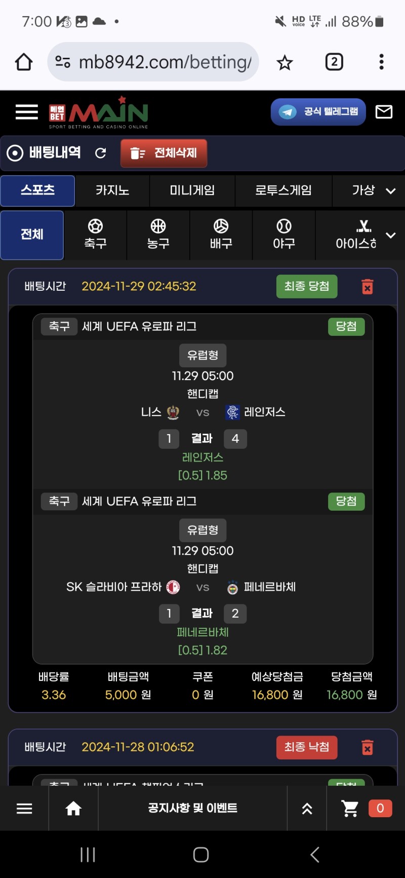 아약스가 골대두번맞히고 후반에2실정 을하면서나가리가됬네요 하지만 충포로걸어둔게맞았습니당..