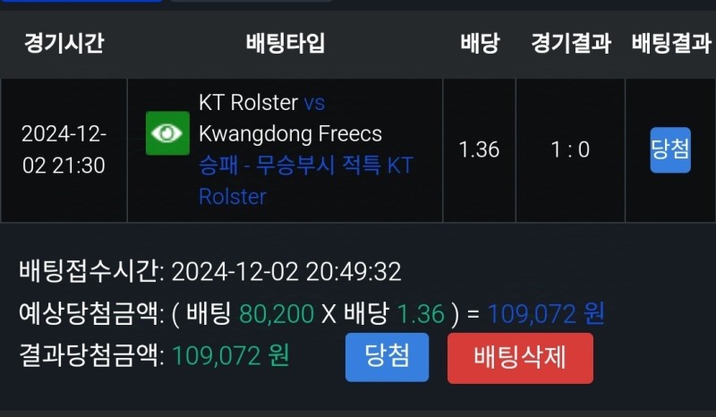 kt가 광동한테 지면 탈락하는 상황이라서 무조건 이긴다고 생각해 낮은 배당이지만 배팅해봤습니다.