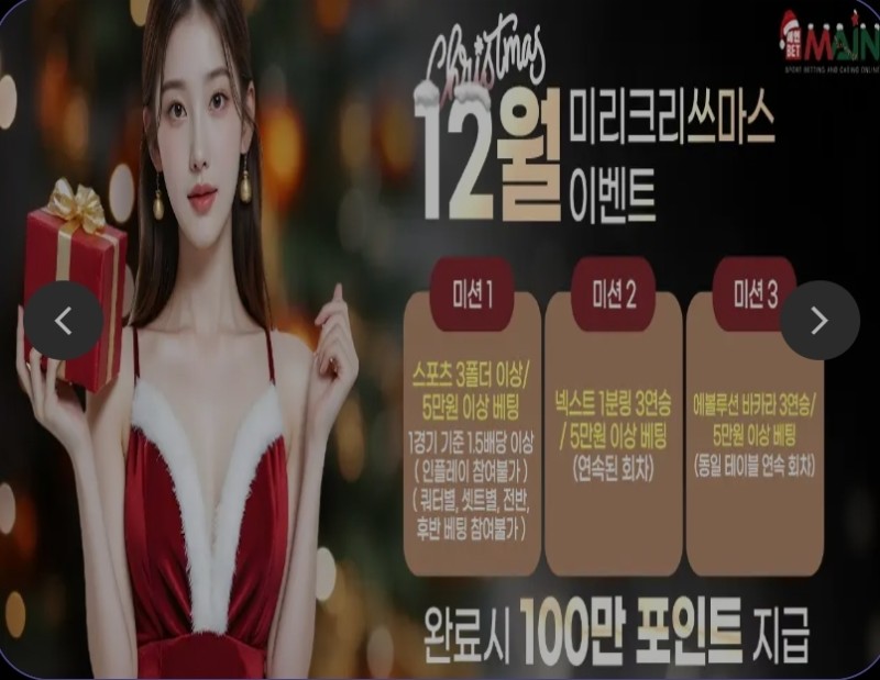 할매티비가 오픈되기전부터 할매 보증업체였던 메인뱃에서 12월 역대급 혜자이벤트를 진행중입니다.