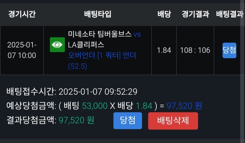 쇼미더벳 미네소타vs클리퍼스 후기 작성자 정보 마당발쪽지보내기 자기소개 닉네임으로 검색쪽지보내기 자기소개 닉네임으로 검색 작성 작성일 2025.01.07 22:21 컨텐츠 정보 707 조회 2 댓글 0 추천 목록 관리 글검색 본문 양팀 선발 라인업 전부 수비 잘하는애들이라 그냥 무지성 1쿼 언더 배팅 예상대로 끈적한 늪농구하며 초초언더 0 추천 관련자료 이전 쇼미더벳 샬럿vs피닉스 후기 작성일 2025.01.08 23:09 다음 레드불 새크vs마앰 후기 작성일 2025.01.07 22:20 댓글 2 기커조님의 댓글 기커조쪽지보내기 자기소개 닉네임으로 검색쪽지보내기 자기소개 닉네임으로 검색 작성일 2025.01.07 22:38 적중축하합니다 적중축하합니다 토태님의 댓글 토태쪽지보내기 자기소개 닉네임으로 검색쪽지보내기 자기소개 닉네임으로 검색 작성일 2025.01.31 22:32 축하여 축하여 로그인한 회원만 댓글 등록이 가능합니다. 목록 관리 글검색