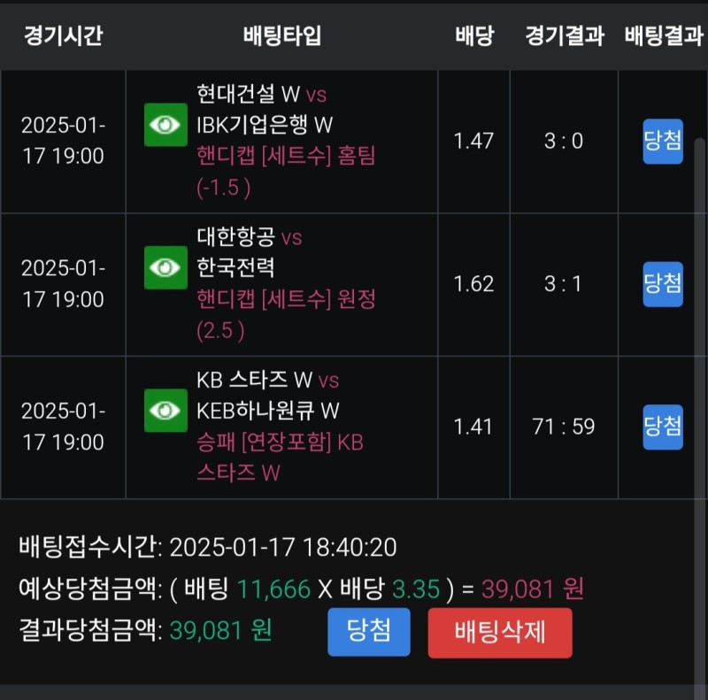풀빠따 현대건설vs기업은행 후기 작성자 정보 마당발쪽지보내기 자기소개 닉네임으로 검색쪽지보내기 자기소개 닉네임으로 검색 작성 작성일 2025.01.17 21:18 컨텐츠 정보 869 조회 2 댓글 0 추천 목록 관리 글검색 본문 페퍼에게 패배한 현대건설과 연패중인 기업은행의 대결 두 팀의 전력차이는 크다고 생각해서 3대0 현건 승에 배팅 시종일관 압도하면서 적중 0 추천 관련자료 이전 레드불 한화vs젠지 후기 작성일 2025.01.17 21:20 다음 풀빠따 BNK썸vs삼성생명 후기 작성일 2025.01.16 21:35 댓글 2 기커조님의 댓글 기커조쪽지보내기 자기소개 닉네임으로 검색쪽지보내기 자기소개 닉네임으로 검색 작성일 2025.01.17 21:38 당첨 축하합니다 당첨 축하합니다 토태님의 댓글 토태쪽지보내기 자기소개 닉네임으로 검색쪽지보내기 자기소개 닉네임으로 검색 작성일 2025.01.31 21:54 축하드려요 축하드려요 로그인한 회원만 댓글 등록이 가능합니다. 목록 관리 글검색