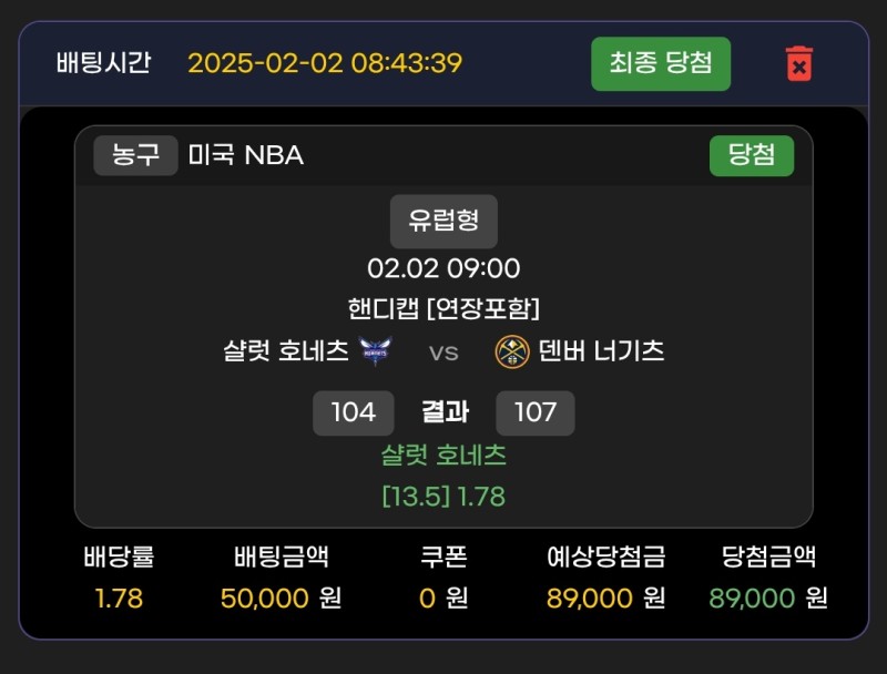 17점차로 벌어졌다가 동점갔다가 했지만 결국 마지막 샬럿의 탱킹행동으로 덴버 똥줄승에 샬럿 플핸 성공