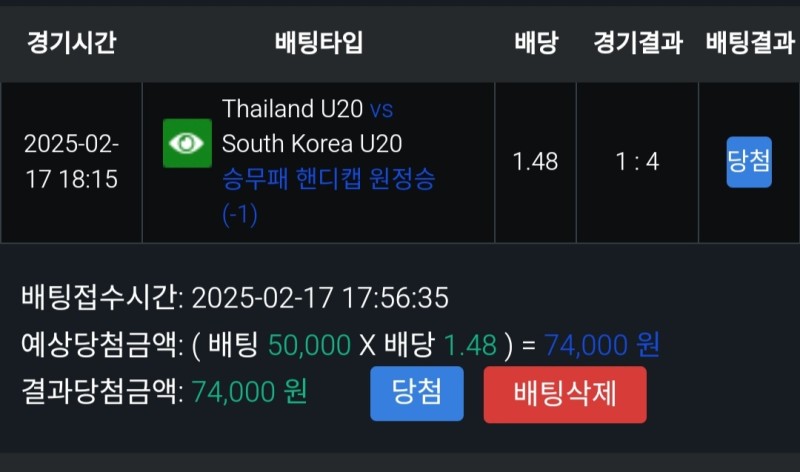 쇼미더벳 태국vs대한민국 후기 작성자 정보 마당발쪽지보내기 자기소개 닉네임으로 검색쪽지보내기 자기소개 닉네임으로 검색 작성 작성일 2025.02.17 20:52 컨텐츠 정보 853 조회 1 댓글 0 추천 목록 관리 글검색 본문 아시안컵 태국vs한국 전력차가 많이나서 2.5마핸 가려다가 안전하게 1.5마핸 배팅 선제골 먹혀서 불안했지만 압도적인 경기력으로 계속 두드려서 대승 0 추천 관련자료 이전 풀빠따 매드vsBDS 후기 작성일 2025.02.17 20:53 다음 레드불 ok금융vs한국전력 후기 작성일 2025.02.16 18:42 댓글 1 기커조님의 댓글 기커조쪽지보내기 자기소개 닉네임으로 검색쪽지보내기 자기소개 닉네임으로 검색 작성일 2025.02.17 21:16 당첨축하합니다 당첨축하합니다 로그인한 회원만 댓글 등록이 가능합니다. 목록 관리 글검색