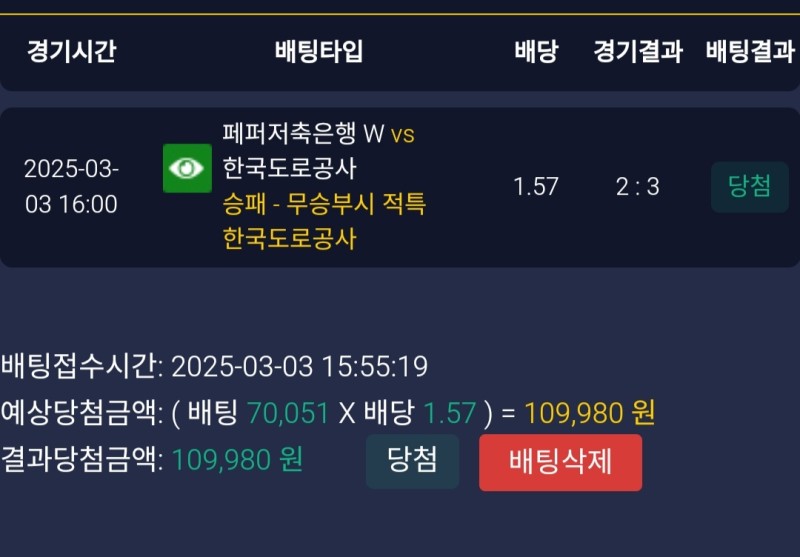 패퍼가 홈이라 도로공사 배당을 좋게 줬지만 약한 공격력으로 수비가 좋은 도공을 이길 수 없을 것 같아서 배팅