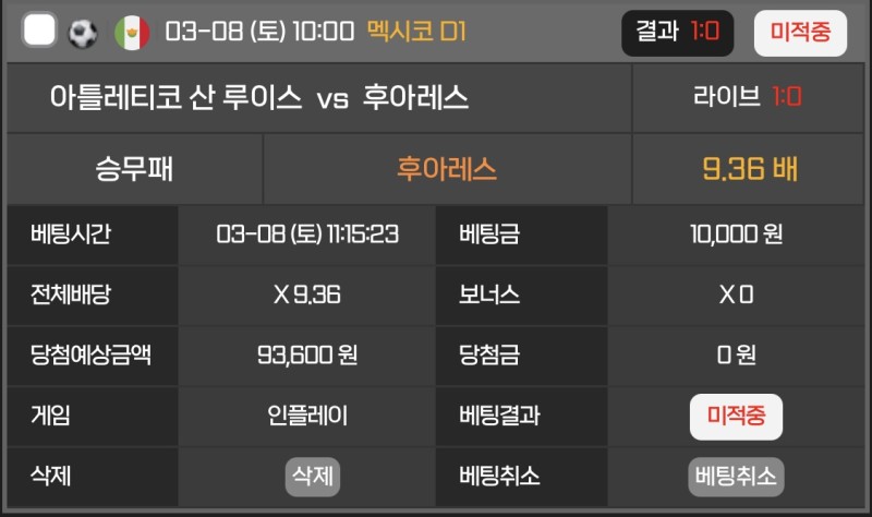 벳 아이 벳! 후기2 작성자 정보 낭만권위자야쪽지보내기 자기소개 닉네임으로 검색쪽지보내기 자기소개 닉네임으로 검색 작성 작성일 2025.03.09 20:56 컨텐츠 정보 939 조회 2 댓글 0 추천 목록 본문 멕시코전반 0.5 오바 꼴고 시작하자마자 홈팀 1-0 넣길래 바로역배 9배 짜투리투척.. 결과는 아무것도없이그대로 홈팀 1-0경종 ㅜㅜ 0 추천 관련자료 이전 메인벳 후기 작성일 2025.03.09 21:51 다음 한폴낙 시리즈 12 작성일 2025.03.09 20:28 댓글 2 기커조님의 댓글 기커조쪽지보내기 자기소개 닉네임으로 검색쪽지보내기 자기소개 닉네임으로 검색 작성일 2025.03.09 21:01 까비입니다 까비입니다 마당발님의 댓글 마당발쪽지보내기 자기소개 닉네임으로 검색쪽지보내기 자기소개 닉네임으로 검색 작성일 2025.03.10 17:28 ㄲㅂ ㄲㅂ 로그인한 회원만 댓글 등록이 가능합니다. 목록