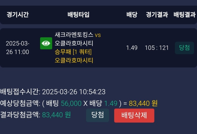 레드불 새크라멘토vs오클라호마 후기 작성자 정보 마당발쪽지보내기 자기소개 닉네임으로 검색쪽지보내기 자기소개 닉네임으로 검색 작성 작성일 2025.03.26 22:05 컨텐츠 정보 965 조회 1 댓글 0 추천 목록 관리 글검색 본문 주전끼리 나오는 1쿼터에는 오클이 무조건 이길 것 같아서 베팅 새크의 핵심인 사보니스가 하텐슈타인한테 계속 막히면서 무난하게 오클 승리 0 추천 관련자료 이전 쇼미더벳 엔씨vs삼성 후기 작성일 2025.03.26 22:10 다음 레드불 에드워드게이밍vs팀we 후기 작성일 2025.03.26 22:02 댓글 1 기커조님의 댓글 기커조쪽지보내기 자기소개 닉네임으로 검색쪽지보내기 자기소개 닉네임으로 검색 작성일 2025.03.26 22:19 축하합니다 축하합니다 로그인한 회원만 댓글 등록이 가능합니다. 목록 관리 글검색