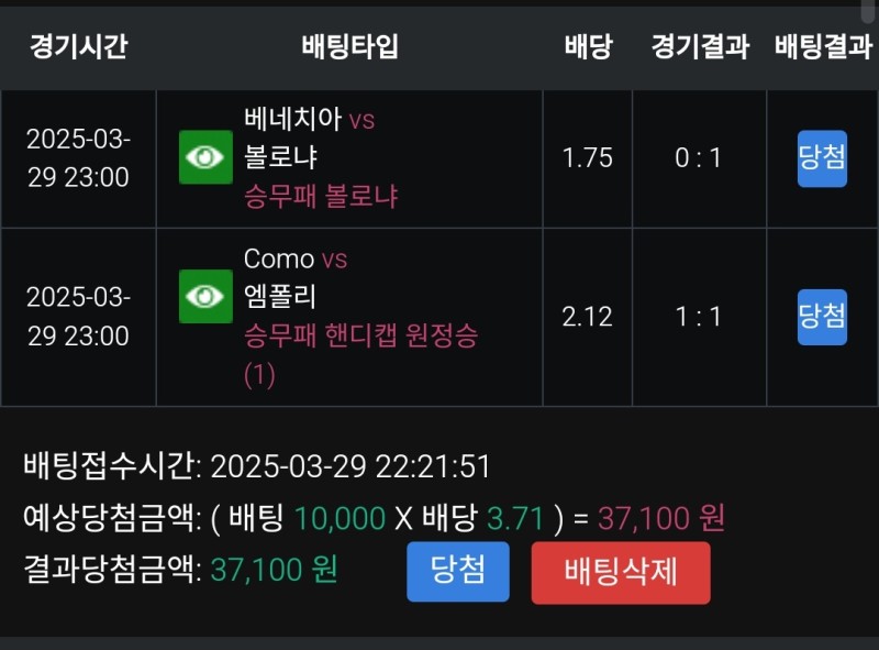 풀빠따 베네치아vs볼로냐 후기 작성자 정보 마당발쪽지보내기 자기소개 닉네임으로 검색쪽지보내기 자기소개 닉네임으로 검색 작성 작성일 2025.03.30 01:06 컨텐츠 정보 891 조회 1 댓글 0 추천 목록 관리 글검색 본문 볼로냐 잘하는 팀인데 배당이 좋길래 베팅 근데 원정이고 주전공격수가 안나와서 그런가 생각보다 경기력이 별로였다 다행히 한골은 넣고 그대로 승리 0 추천 관련자료 이전 레드불 에스파뇰vs아틀레티코마드리드 후기 작성일 2025.03.30 02:20 다음 풀빠따 치바롯데vs소프트뱅크 후기 작성일 2025.03.29 20:15 댓글 1 기커조님의 댓글 기커조쪽지보내기 자기소개 닉네임으로 검색쪽지보내기 자기소개 닉네임으로 검색 작성일 2025.03.30 01:23 당첨축하요 당첨축하요 로그인한 회원만 댓글 등록이 가능합니다. 목록 관리 글검색
