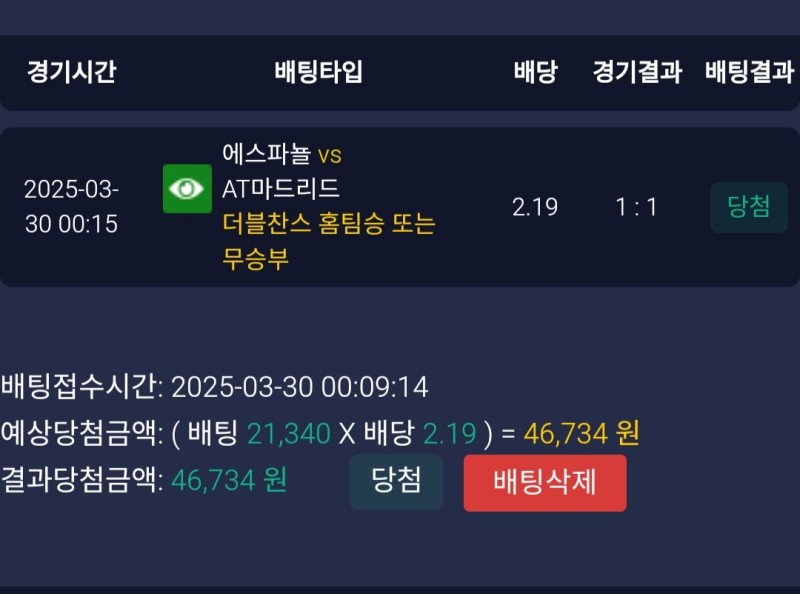 레드불 에스파뇰vs아틀레티코마드리드 후기 작성자 정보 마당발쪽지보내기 자기소개 닉네임으로 검색쪽지보내기 자기소개 닉네임으로 검색 작성 작성일 2025.03.30 02:20 컨텐츠 정보 892 조회 1 댓글 0 추천 목록 관리 글검색 본문 at가 에스파뇰만 만나면 은근 못이기던 기억이 있어서 플핸 베팅 at마드리드가 선제골 넣어서 쫄렸지만 추가득점은 못하고 에스파뇰이 동점 만들고 끝나서 적중 0 추천 관련자료 이전 레드불 홀슈타인킬vs브레멘 후기 작성일 2025.03.30 16:03 다음 풀빠따 베네치아vs볼로냐 후기 작성일 2025.03.30 01:06 댓글 1 기커조님의 댓글 기커조쪽지보내기 자기소개 닉네임으로 검색쪽지보내기 자기소개 닉네임으로 검색 작성일 2025.03.30 02:46 축하합니다 축하합니다 로그인한 회원만 댓글 등록이 가능합니다. 목록 관리 글검색