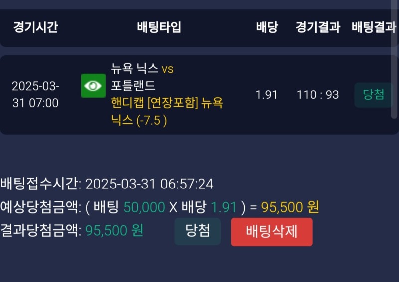 레드불 뉴욕vs포틀랜드 후기 작성자 정보 마당발쪽지보내기 자기소개 닉네임으로 검색쪽지보내기 자기소개 닉네임으로 검색 작성 작성일 2025.03.31 11:20 컨텐츠 정보 935 조회 1 댓글 0 추천 목록 관리 글검색 본문 뉴욕 라인업이 좋아보여서 마핸 베팅했는데 자꾸 포틀랜드가 잘 비벼서 터지는줄 그런데 4쿼터에 빡세게 수비하니까 급격하게 벌어지면서 적중 0 추천 관련자료 이전 쇼미더벳 피츠버그vs마이애미 후기 작성일 2025.03.31 15:40 다음 레드불 애리조나vs컵스 후기 작성일 2025.03.31 11:19 댓글 1 기커조님의 댓글 기커조쪽지보내기 자기소개 닉네임으로 검색쪽지보내기 자기소개 닉네임으로 검색 작성일 2025.03.31 11:54 축하합니다 축하합니다 로그인한 회원만 댓글 등록이 가능합니다. 목록 관리 글검색