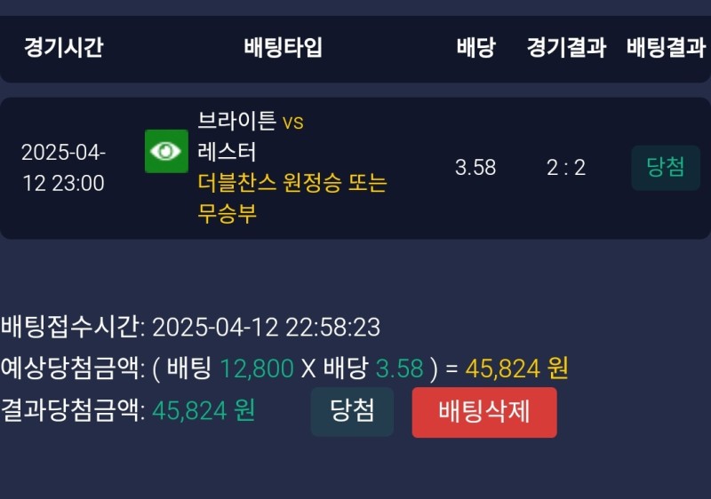 레드불 브라이튼vs레스터 후기 작성자 정보 마당발쪽지보내기 자기소개 닉네임으로 검색쪽지보내기 자기소개 닉네임으로 검색 작성 작성일 2025.04.13 17:25 컨텐츠 정보 943 조회 1 댓글 0 추천 목록 관리 글검색 본문 레스터 9연패중이길래 10연패는 안하겠지 싶어 승무 베팅 선제골먹혀서 무난히 지는줄 알았는데 계속 끈질기게 동점만드는게 눈물겨웠다 하지만 강등될듯 0 추천 관련자료 이전 풀빠따 아스날vs브랜트포드 후기 작성일 2025.04.13 19:46 다음 레드불 컵스vs다저스 후기 작성일 2025.04.13 17:23 댓글 1 기커조님의 댓글 기커조쪽지보내기 자기소개 닉네임으로 검색쪽지보내기 자기소개 닉네임으로 검색 작성일 2025.04.13 17:32 축하드려요 축하드려요 로그인한 회원만 댓글 등록이 가능합니다. 목록 관리 글검색