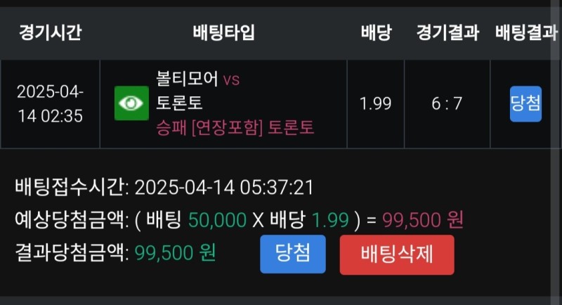 풀빠따 토론토vs볼티모어 후기 작성자 정보 마당발쪽지보내기 자기소개 닉네임으로 검색쪽지보내기 자기소개 닉네임으로 검색 작성 작성일 2025.04.14 07:44 컨텐츠 정보 966 조회 2 댓글 0 추천 목록 관리 글검색 본문 토론토가 지다가 후반에 동점 만들었길래 불펜싸움 이긴다고 보고 실시간 베팅 연장전에 돌입해서 토론토는 어떻게 1점 짜내고 볼티모어 무사 2루는 막아내면서 승리 0 추천 관련자료 이전 풀빠따 샌안토니오vs토론토 후기 작성일 2025.04.14 07:46 다음 멤피스 뉴캐슬vs맨유 후기 작성일 2025.04.14 05:48 댓글 2 기커조님의 댓글 기커조쪽지보내기 자기소개 닉네임으로 검색쪽지보내기 자기소개 닉네임으로 검색 작성일 2025.04.14 11:41 당첨축하요 당첨축하요 켄트퍼플님의 댓글 켄트퍼플쪽지보내기 자기소개 닉네임으로 검색쪽지보내기 자기소개 닉네임으로 검색 작성일 2025.04.14 23:05 축하드립니다 축하드립니다 로그인한 회원만 댓글 등록이 가능합니다. 목록 관리 글검색