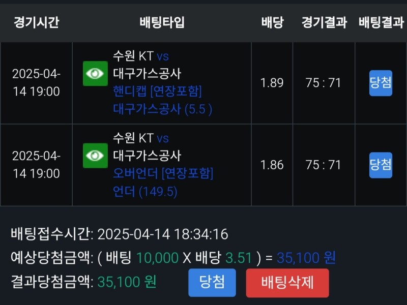 쇼미더벳 가스공사vs수원kt 후기 작성자 정보 마당발쪽지보내기 자기소개 닉네임으로 검색쪽지보내기 자기소개 닉네임으로 검색 작성 작성일 2025.04.14 23:58 컨텐츠 정보 983 조회 1 댓글 0 추천 목록 관리 글검색 본문 양팀 수비가 좋아서 언더랑 가스 플핸 베팅 막판에 가스 득점이 멈춰서 마핸당하는줄 알았는데 kt도 같이 놀아준 덕분에 겨우 적중 0 추천 관련자료 이전 레드불 본머스vs풀럼 후기 작성일 2025.04.15 21:04 다음 쇼미더벳 KT2군vs프릭스2군 작성일 2025.04.14 23:57 댓글 1 기커조님의 댓글 기커조쪽지보내기 자기소개 닉네임으로 검색쪽지보내기 자기소개 닉네임으로 검색 작성일 2025.04.15 00:40 당첨축하요 당첨축하요 로그인한 회원만 댓글 등록이 가능합니다. 목록 관리 글검색