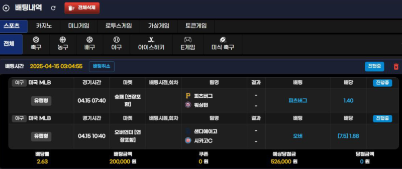 메인뱃) MLB 후기 작성자 정보 김배틀쪽지보내기 자기소개 닉네임으로 검색쪽지보내기 자기소개 닉네임으로 검색 작성 작성일 2025.04.15 12:58 컨텐츠 정보 971 조회 1 댓글 0 추천 목록 관리 글검색 본문 피츠버그는 스킨스 푸근했고 샌디에이고 오버는 마지막에 시카고컵스 볼쟁이 올라오면서 선픽리그전 1승 성공!! 0 추천 관련자료 이전 멤피스 야구 후기 작성일 2025.06.03 22:35 다음 멤피스 해외축구 후기 작성일 2025.04.14 12:02 댓글 1 기커조님의 댓글 기커조쪽지보내기 자기소개 닉네임으로 검색쪽지보내기 자기소개 닉네임으로 검색 작성일 2025.04.15 14:07 축하합니다 축하합니다 로그인한 회원만 댓글 등록이 가능합니다. 목록 관리 글검색