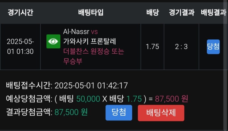 풀빠따 알 나스르vs가와사키 후기 작성자 정보 마당발쪽지보내기 자기소개 닉네임으로 검색쪽지보내기 자기소개 닉네임으로 검색 작성 작성일 2025.05.01 15:53 컨텐츠 정보 936 조회 1 댓글 0 추천 목록 관리 글검색 본문 가와사키가 좀 치는데 1대0으로 이길때 승무배당 좋길래 실시간 베팅. 무뜰줄 알았는데 생각보다 더 잘해주면서 쌩역배로 적중 0 추천 관련자료 이전 풀빠따 샌프vs콜로라도 후기 작성일 2025.05.02 22:21 다음 레드불 샌디vs샌프 후기 작성일 2025.05.01 15:51 댓글 1 기커조님의 댓글 기커조쪽지보내기 자기소개 닉네임으로 검색쪽지보내기 자기소개 닉네임으로 검색 작성일 2025.05.01 18:43 축하합니다 축하합니다 로그인한 회원만 댓글 등록이 가능합니다. 목록 관리 글검색
