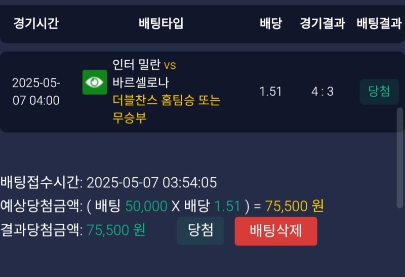 인테르가 2대0으로 시작해서 쉽게 먹을 줄 알았는데 그걸 역전당해서 쫄깃했다가 다시 1차전처럼 3대3 동점으로 끝나서 적중