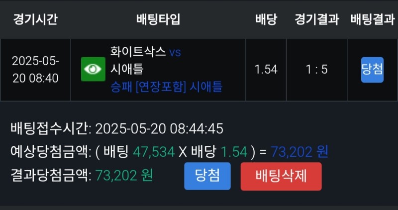 쇼미더벳 시애틀vs화이트삭스 후기 작성자 정보 마당발쪽지보내기 자기소개 닉네임으로 검색쪽지보내기 자기소개 닉네임으로 검색 작성 작성일 2025.05.20 18:34 컨텐츠 정보 929 조회 2 댓글 0 추천 목록 관리 글검색 본문 시애틀 선발 카스티요인데 1.5배나 주길래 베팅 중반까지 불안하게 1점차 리드였지만 마지막에 훌리오 그랜드슬램으로 푸근하게 승리 0 추천 관련자료 이전 풀빠따 휴스턴vs템파베이 후기 작성일 2025.05.20 18:35 다음 쇼미더벳 세인트루이스vs디트로이트 후기 작성일 2025.05.20 18:31 댓글 2 기커조님의 댓글 기커조쪽지보내기 자기소개 닉네임으로 검색쪽지보내기 자기소개 닉네임으로 검색 작성일 2025.05.20 19:38 축하합니다 축하합니다 은하단님의 댓글 은하단쪽지보내기 자기소개 닉네임으로 검색쪽지보내기 자기소개 닉네임으로 검색 작성일 2025.06.03 02:05 축축 축축 로그인한 회원만 댓글 등록이 가능합니다. 목록 관리 글검색
