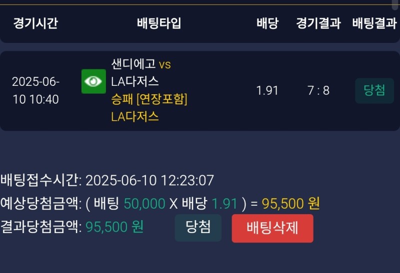 레드불 다저스vs샌디 후기 작성자 정보 마당발쪽지보내기 자기소개 닉네임으로 검색쪽지보내기 자기소개 닉네임으로 검색 작성 작성일 2025.06.10 15:05 컨텐츠 정보 894 조회 1 댓글 0 추천 목록 관리 글검색 본문 킹혜성의 동점적시타에 힘입어서 연장승리 0 추천 관련자료 이전 레드불 크로아티아vs체코 후기 작성일 2025.06.10 15:06 다음 레드불 보스턴 레드삭스vs뉴욕 양키스 후기 작성일 2025.06.09 11:42 댓글 1 기커조님의 댓글 기커조쪽지보내기 자기소개 닉네임으로 검색쪽지보내기 자기소개 닉네임으로 검색 작성일 2025.06.10 19:14 당첨축하요 당첨축하요 로그인한 회원만 댓글 등록이 가능합니다. 목록 관리 글검색