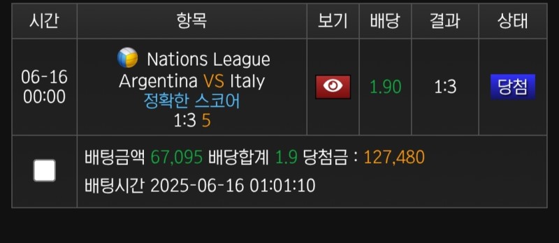 쇼미더벳 아르헨티나vs이탈리아 후기 작성자 정보 마당발쪽지보내기 자기소개 닉네임으로 검색쪽지보내기 자기소개 닉네임으로 검색 작성 작성일 2025.06.16 10:46 컨텐츠 정보 331 조회 2 댓글 0 추천 목록 관리 글검색 본문 3세트 4점차 열세를 무한듀스끝에 역전해서 적중 0 추천 관련자료 이전 쇼미더벳 밀워키vs세인트루이스 후기 작성일 2025.06.16 10:47 다음 메인벳 ssg랜더스vs롯데 후기 작성일 2025.06.15 19:59 댓글 2 제이덥님의 댓글 제이덥쪽지보내기 자기소개 닉네임으로 검색쪽지보내기 자기소개 닉네임으로 검색 작성일 2025.06.16 18:04 굿 굿 기커조님의 댓글 기커조쪽지보내기 자기소개 닉네임으로 검색쪽지보내기 자기소개 닉네임으로 검색 작성일 2025.06.16 18:22 당첨축하요 당첨축하요 로그인한 회원만 댓글 등록이 가능합니다. 목록 관리 글검색