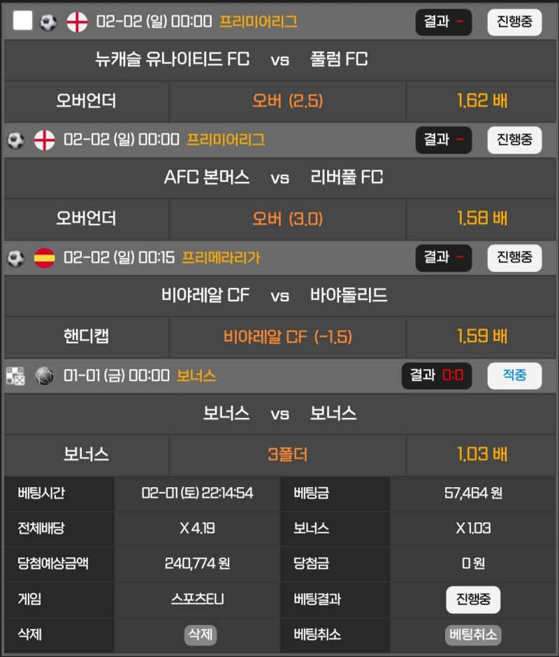 뉴캐슬 2.5옵 본머스 3옵 비야1.5마핸