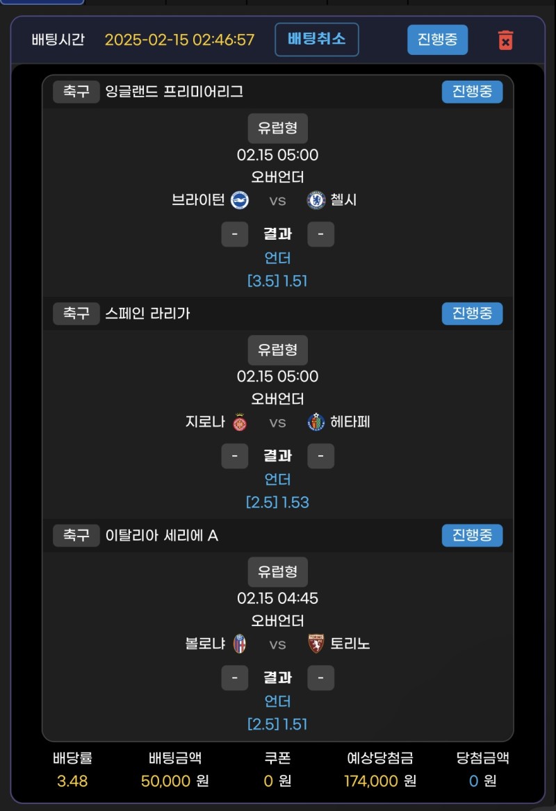 볼로냐 2.5 언더, 첼시 3.5 언더, 지로나 2.5 언더
