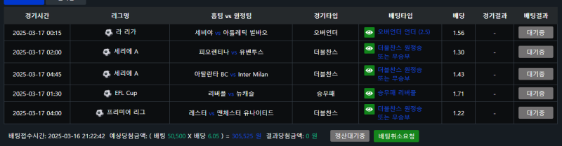 세비야 2.5 언더, 리버풀 승, 유벤투스 승무, 맨유 승무, 인터밀란 승무