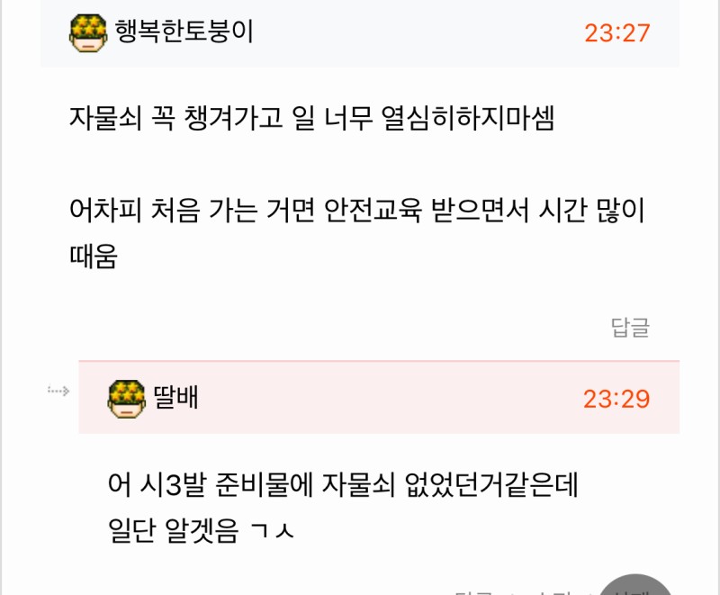 대수성님의 댓글 대수성쪽지보내기 자기소개 닉네임으로 검색쪽지보내기 자기소개 닉네임으로 검색 작성일 2024.11.15 23:38 자물쇠 준비물에 없었으면 거기서 줄듯 자물쇠 준비물에 없었으면 거기서 줄듯