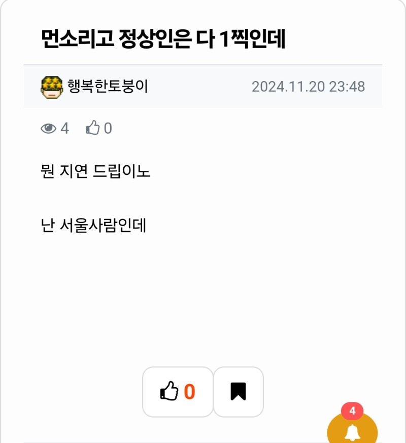 행붕아 너 지금 작성자 정보 대수성쪽지보내기 자기소개 닉네임으로 검색쪽지보내기 자기소개 닉네임으로 검색 작성 작성일 2024.11.20 23:52 컨텐츠 정보 198 조회 3 댓글 0 추천 목록 본문 윤석열 대통령 뽑은 최관님 비하한거니? 0 추천 관련자료 이전 오늘 피방에서 커플 둘이 남돌이상형월드컵 하더라 작성일 2024.11.20 23:54 다음 토론 주제 : 윤석열의 국정농단사건 작성일 2024.11.20 23:52 댓글 3 행복한토붕이님의 댓글 행복한토붕이쪽지보내기 자기소개 닉네임으로 검색쪽지보내기 자기소개 닉네임으로 검색 작성일 2024.11.20 23:53 최관님이 그랬을리가 없음 최관님이 그랬을리가 없음 두두님의 댓글 두두쪽지보내기 자기소개 닉네임으로 검색쪽지보내기 자기소개 닉네임으로 검색 작성일 2024.11.21 07:43 이건좀그래 이건좀그래 리을님의 댓글 리을쪽지보내기 자기소개 닉네임으로 검색쪽지보내기 자기소개 닉네임으로 검색 작성일 2024.11.21 11:45 행붕아 머선일이고 행붕아 머선일이고 로그인한 회원만 댓글 등록이 가능합니다. 목록