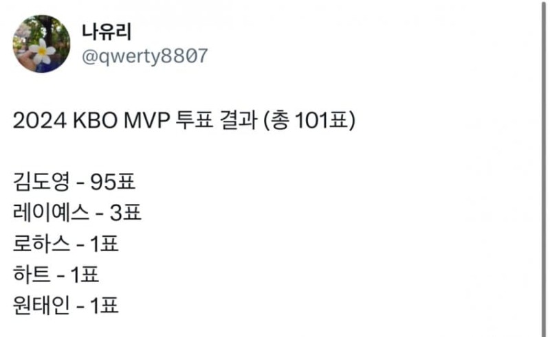 릴등병님의 댓글 릴등병쪽지보내기 자기소개 닉네임으로 검색쪽지보내기 자기소개 닉네임으로 검색 작성일 2024.11.26 15:38 로하스 원태인 1표는 뭐냐 ㄹㅇ.. 레이예스는 신기록 쓰기라도 했고 하트는 젤 잘 던지기라도 했지 로하스 원태인 1표는 뭐냐 ㄹㅇ.. 레이예스는 신기록 쓰기라도 했고 하트는 젤 잘 던지기라도 했지